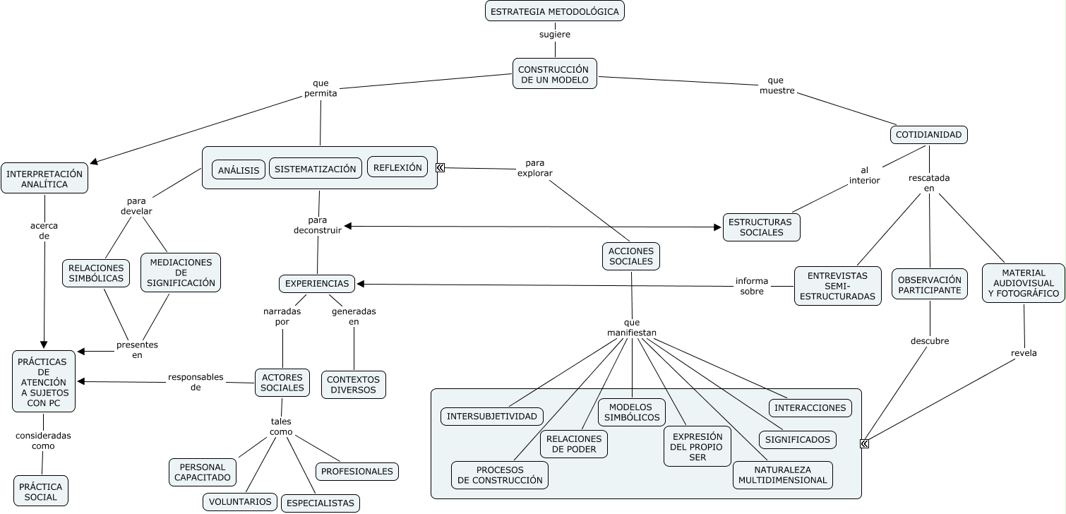 Este Cmap, tiene información relacionada con: APROXIMACIÓN A LA METODOLOGÍA DE INVESTIGACIÓN, CONSTRUCCIÓN DE UN MODELO que permita ????, RELACIONES SIMBÓLICAS presentes en PRÁCTICAS DE ATENCIÓN A SUJETOS CON PC, MATERIAL AUDIOVISUAL Y FOTOGRÁFICO revela ????, ACCIONES SOCIALES que manifiestan INTERACCIONES, ACCIONES SOCIALES que manifiestan INTERSUBJETIVIDAD, ACTORES SOCIALES tales como PROFESIONALES, EXPERIENCIAS generadas en CONTEXTOS DIVERSOS, MEDIACIONES DE SIGNIFICACIÓN presentes en PRÁCTICAS DE ATENCIÓN A SUJETOS CON PC, ???? para develar RELACIONES SIMBÓLICAS, ACCIONES SOCIALES que manifiestan PROCESOS DE CONSTRUCCIÓN, COTIDIANIDAD rescatada en OBSERVACIÓN PARTICIPANTE, OBSERVACIÓN PARTICIPANTE descubre ????, COTIDIANIDAD rescatada en MATERIAL AUDIOVISUAL Y FOTOGRÁFICO, ACCIONES SOCIALES que manifiestan SIGNIFICADOS, ACTORES SOCIALES tales como ESPECIALISTAS, COTIDIANIDAD rescatada en ENTREVISTAS SEMI- ESTRUCTURADAS, ENTREVISTAS SEMI- ESTRUCTURADAS informa sobre EXPERIENCIAS, CONSTRUCCIÓN DE UN MODELO que muestre COTIDIANIDAD, ACTORES SOCIALES tales como VOLUNTARIOS, ACCIONES SOCIALES que manifiestan NATURALEZA MULTIDIMENSIONAL