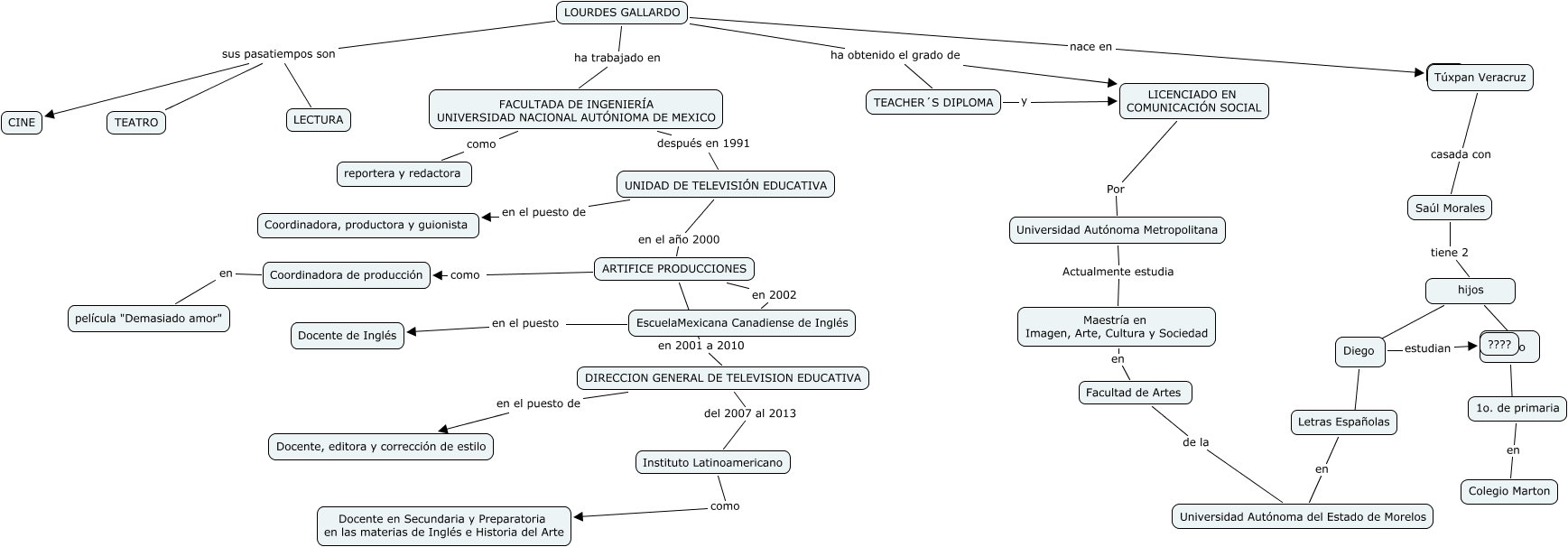 Este Cmap, tiene información relacionada con: LOURDES gALLARDO, LOURDES GALLARDO ha trabajado en FACULTADA DE INGENIERÍA UNIVERSIDAD NACIONAL AUTÓNIOMA DE MEXICO, LICENCIADO EN COMUNICACIÓN SOCIAL Por Universidad Autónoma Metropolitana, Instituto Latinoamericano como Docente en Secundaria y Preparatoria en las materias de Inglés e Historia del Arte, Túxpan Veracruz casada con Saúl Morales, FACULTADA DE INGENIERÍA UNIVERSIDAD NACIONAL AUTÓNIOMA DE MEXICO como reportera y redactora, ARTIFICE PRODUCCIONES como Coordinadora de producción, hijos ???? Diego, LOURDES GALLARDO sus pasatiempos son TEATRO, UNIDAD DE TELEVISIÓN EDUCATIVA en el puesto de Coordinadora, productora y guionista, Universidad Autónoma Metropolitana Actualmente estudia Maestría en Imagen, Arte, Cultura y Sociedad, Diego estudian ????, Letras Españolas en Universidad Autónoma del Estado de Morelos, LOURDES GALLARDO nace en ????, TEACHER´S DIPLOMA y LICENCIADO EN COMUNICACIÓN SOCIAL, DIRECCION GENERAL DE TELEVISION EDUCATIVA del 2007 al 2013 Instituto Latinoamericano, EscuelaMexicana Canadiense de Inglés en el puesto Docente de Inglés, UNIDAD DE TELEVISIÓN EDUCATIVA en el año 2000 ARTIFICE PRODUCCIONES, ARTIFICE PRODUCCIONES en 2001 a 2010 DIRECCION GENERAL DE TELEVISION EDUCATIVA, 1o. de primaria en Colegio Marton, Coordinadora de producción en película "Demasiado amor"