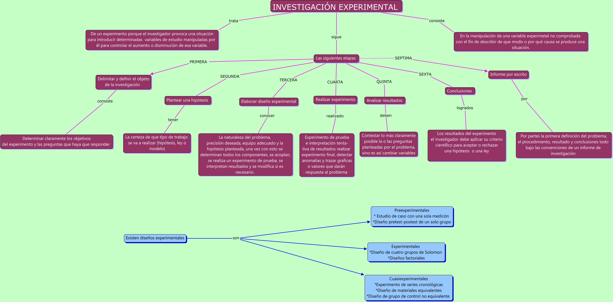 Este Cmap, tiene información relacionada con: Investigación Experimental, Las siguientes etapas PRIMERA Delimitar y definir el objeto de la investigación, Las siguientes etapas SEPTIMA Informe por escrito, Las siguientes etapas SEGUNDA Plantear una hipótesis, Delimitar y definir el objeto de la investigación consiste Determinar claramente los objetivos del experimento y las preguntas que haya que responder, Plantear una hipótesis tener La certeza de que tipo de trabajo se va a realizar (hipótesis, ley o modelo), Existen diseños experimentales son Experimentales *Diseño de cuatro grupos de Solomon *Diseños factoriales, INVESTIGACIÓN EXPERIMENTAL trata De un experimento porque el investigador provoca una situación para introducir determinadas variables de estudio manipuladas por él para controlar el aumento o disminución de esa variable., Las siguientes etapas CUARTA Realizar experimento, Existen diseños experimentales son Preexperimentales * Estudio de caso con una sola medicón *Diseño pretest-postest de un solo grupo, Informe por escrito por Por partes la primera definición del problema, el procedimiento, resultado y conclusiones todo bajo las convenciones de un informe de investigación, Las siguientes etapas TERCERA Elaborar diseño experimental, Realizar experimento realizado Experimento de prueba e interpretación tenta- tiva de resultados realizar experimento final, detectar anomalías y trazar graficas o valores que darán respuesta al problema, INVESTIGACIÓN EXPERIMENTAL sigue Las siguientes etapas, Las siguientes etapas SEXTA Conclusiones, Existen diseños experimentales son Cuasiexperimentales *Experimento de series cronológicas *Diseño de materiales equivalentes *Diseño de grupo de control no equivalente, Conclusiones logrados Los resultados del experimento el investigador debe aplicar su criterio científico para aceptar o rechazar una hipótesis o una ley, Analizar resultados deben Contestar lo más claramente posible la o las preguntas planteadas por el problema, sino es así cambiar variables, INVESTIGACIÓN EXPERIMENTAL consiste En la manipulación de una variable experimetal no comprobada con el fin de describir de que modo o por qué causa se produce una situación., Elaborar diseño experimental conocer La naturaleza del problema, precisión deseada, equipo adecuado y la hipótesis planteada, una vez con esto se determinan todos los componentes, se acoplan, se realiza un experimento de prueba, se interpretan resultados y se modifica si es necesario., Las siguientes etapas QUINTA Analizar resultados