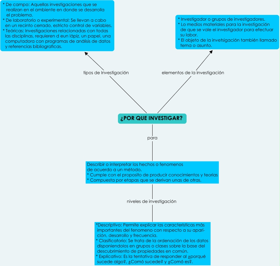 Este Cmap, tiene información relacionada con: Duarte Esquivel Miriam, ¿POR QUE INVESTIGAR? para Describir o interpretar los hechos o fenomenos de acuerdo a un método. * Cumple con el proposito de producir conocimientos y teorias * Compuesta por etapas que se derivan unas de otras., Describir o interpretar los hechos o fenomenos de acuerdo a un método. * Cumple con el proposito de producir conocimientos y teorias * Compuesta por etapas que se derivan unas de otras. niveles de investigación *Descriptivo: Permite explicar las caracteristicas más importantes del fenomeno con respecto a su apari- ción, desarrollo y frecuencia. * Clasificatorio: Se trata de la ordenación de los datos disponiendolos en grupos o clases sobre la base del descubrimiento de propiedades en común. * Explicativo: Es la tentativa de responder al ¿porqué sucede algo?, ¿Comó sucede? y ¿Comó es?., ¿POR QUE INVESTIGAR? tipos de Investigación * De campo: Aquellas investigaciones que se realizan en el ambiente en donde se desarrolla el problema. * De laboratorio o experimental: Se llevan a cabo en un recinto cerrado, estricto control de variables. * Teóricas: Investigaciones relacionadas con todas las disciplinas, requieren d eun lápiz, un papel, una computadora con programas de análisis de datos y referencias bibliograficas., ¿POR QUE INVESTIGAR? elementos de la investigación * Investigador o grupos de investigadores. * Lo medios materiales para la investigación de que se vale el investigador para efectuar su labor. * El objeto de la invetsigación también llamado tema o asunto.