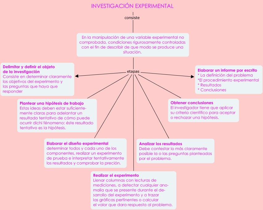 Este Cmap, tiene información relacionada con: MAPA 2 DUARTE ESQUIVEL MIRIAM, En la manipulación de una variable experimental no comprobada, condiciones rigurosamente controladas con el fin de describir de que modo se produce una situación. etapas Analizar los resultados Debe contestar lo más claramente posible la o las preguntas planteadas por el problema., INVESTIGACIÓN EXPERIMENTAL consiste En la manipulación de una variable experimental no comprobada, condiciones rigurosamente controladas con el fin de describir de que modo se produce una situación., En la manipulación de una variable experimental no comprobada, condiciones rigurosamente controladas con el fin de describir de que modo se produce una situación. etapas Realizar el experimento Llenar columnas con lecturas de mediciones, a detectar cualquier ano- malia que se presente durante el de- sarrollo del experimento y a trazar las gráficas pertinentes o calcular el valor que dara respuesta al problema., En la manipulación de una variable experimental no comprobada, condiciones rigurosamente controladas con el fin de describir de que modo se produce una situación. etapas Obtener conclusiones El investigador tiene que aplicar su criterio cientifico para aceptar o rechazar una hipótesis., En la manipulación de una variable experimental no comprobada, condiciones rigurosamente controladas con el fin de describir de que modo se produce una situación. etapas Elaborar el diseño experimental determinar todos y cada uno de los componentes, realizar un experimento de prueba e interpretar tentativamente los resultados y comprobar la preción., En la manipulación de una variable experimental no comprobada, condiciones rigurosamente controladas con el fin de describir de que modo se produce una situación. etapas Delimitar y definir el objeto de la investigación Consiste en determinar claramente los objetivos del experimento y las preguntas que haya que responder, En la manipulación de una variable experimental no comprobada, condiciones rigurosamente controladas con el fin de describir de que modo se produce una situación. etapas Elaborar un informe por escrito * La definición del problema *El procedimiento experimental * Resultados * Conclusiones, En la manipulación de una variable experimental no comprobada, condiciones rigurosamente controladas con el fin de describir de que modo se produce una situación. etapas Plantear una hipótesis de trabajo Estas ideas deben estar suficiente- mente claras para adelantar un resultado tentativo de cómo puede ocurrir dichi fénomeno: éste resultado tentativo es la hipótesis.