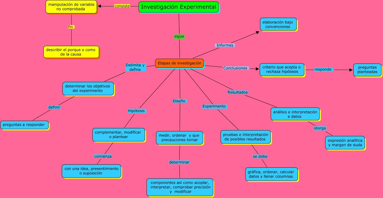 Este Cmap, tiene información relacionada con: Investigación Experimental, medir, ordenar y que precauciones tomar determinar componentes así como acoplar, interpretar, comprobar precisión y modificar, Etapas de investigación Resultados análisis e interpretación e datos, Investigación Experimental consiste manipulación de variable no comprobada, determinar los objetivos del experimento definir preguntas a responder, Investigación Experimental sigue Etapas de investigación, manipulación de variable no comprobada fin describir el porque o como de la causa, complementar, modificar o plantear comienza con una idea, presentimiento o suposición, Etapas de investigación Hipótesis complementar, modificar o plantear, Etapas de investigación Diseño medir, ordenar y que precauciones tomar, Etapas de investigación Experimento pruebas e interpretación de posibles resultados, criterio que acepta o rechaza hipótesis responde preguntas planteadas, Etapas de investigación Informes elaboración bajo convenciones, análisis e interpretación e datos otorga expresión analítica y margen de duda, Etapas de investigación Delimita y define determinar los objetivos del experimento, pruebas e interpretación de posibles resultados se debe gráfica, ordenar, calcular datos y llenar columnas, Etapas de investigación Conclusiones criterio que acepta o rechaza hipótesis