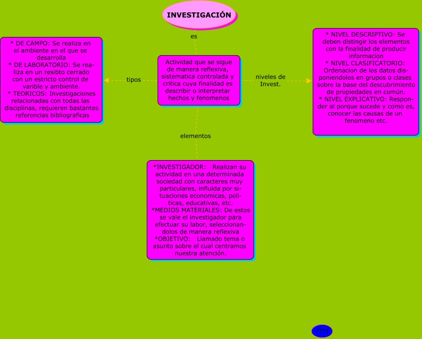 Este Cmap, tiene información relacionada con: MAPA 1 HERNANDEZ CANO YOSELIN.cmap, INVESTIGACIÓN es Actividad que se sigue de manera reflexiva, sistematica controlada y critica cuya finalidad es describir o interpretar hechos y fenomenos, Actividad que se sigue de manera reflexiva, sistematica controlada y critica cuya finalidad es describir o interpretar hechos y fenomenos elementos *INVESTIGADOR: Realizan su actividad en una determinada sociedad con caracteres muy particulares, influida por si- tuaciones economicas, poli- ticas, educativas, etc. *MEDIOS MATERIALES: De estos se vale el investigador para efectuar su labor, seleccionan- dolos de manera reflexiva *OBJETIVO: Llamado tema o asunto sobre el cual centramos nuestra atención., Actividad que se sigue de manera reflexiva, sistematica controlada y critica cuya finalidad es describir o interpretar hechos y fenomenos niveles de Invest. * NIVEL DESCRIPTIVO: Se deben distingir los elementos con la finalidad de producir informacion * NIVEL CLASIFICATORIO: Ordenacion de los datos dis- poniendolos en grupos o clases sobre la base del descubrimiento de propiedades en común. * NIVEL EXPLICATIVO: Respon- der al porque sucede y como es, conocer las causas de un fenomeno etc., Actividad que se sigue de manera reflexiva, sistematica controlada y critica cuya finalidad es describir o interpretar hechos y fenomenos tipos * DE CAMPO: Se realiza en el ambiente en el que se desarrolla * DE LABORATORIO: Se rea- liza en un resibto cerrado con un estricto control de varible y ambiente. * TEORICOS: Investigaciones relacionadas con todas las disciplinas, requieren bastantes referencias bibliograficas