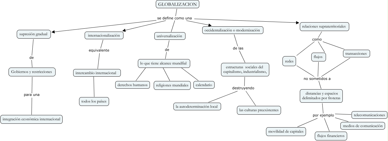 Este Cmap, tiene información relacionada con: Globalización, GLOBALIZACION se define como una internacionalización, occidentalización o modernización de las estructuras sociales del capitalismo, industrialismo,, GLOBALIZACION se define como una occidentalización o modernización, GLOBALIZACION se define como una universalización, internacionalización equivalente intercambio internacional, estructuras sociales del capitalismo, industrialismo, destruyendo la autodeterminación local, telecomunicaciones por ejemplo flujos financieros, redes no sometidos a distancias y espacios delimitados por froteras, Gobiernos y restricciones para una integración económica internacional, flujos no sometidos a distancias y espacios delimitados por froteras, distancias y espacios delimitados por froteras por ejemplo flujos financieros, GLOBALIZACION se define como una relaciones supraterritoriales, GLOBALIZACION se define como una supresión gradual, distancias y espacios delimitados por froteras por ejemplo movilidad de capitales, religiones mundiales ???? lo que tiene alcance mundfial, calendario ???? lo que tiene alcance mundfial, universalización de lo que tiene alcance mundfial, relaciones supraterritoriales como redes, estructuras sociales del capitalismo, industrialismo, destruyendo las culturas preexistentes, medios de comunicación por ejemplo flujos financieros