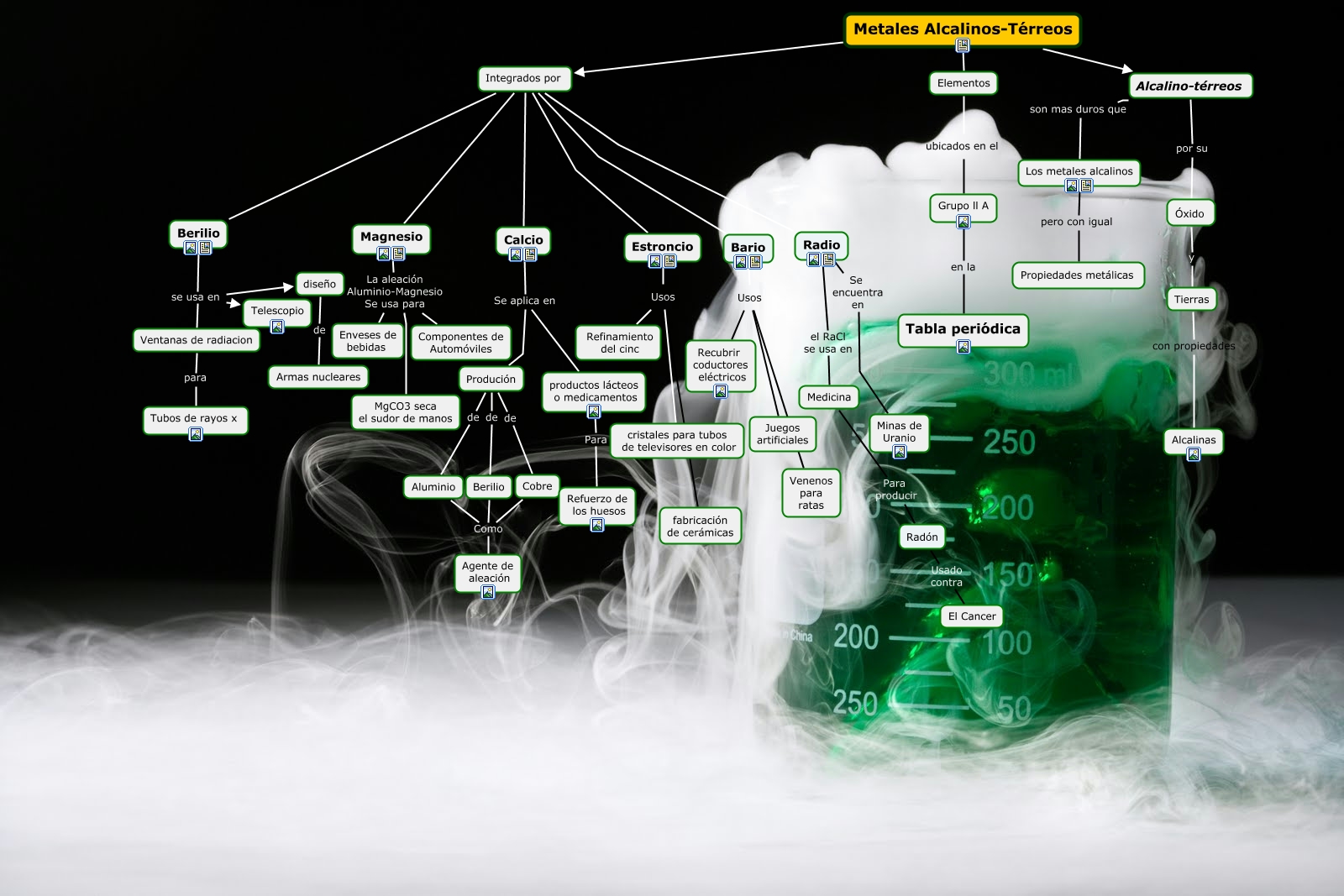 Este Cmap, tiene información relacionada con: Metales alcalinoterreos, Los metales alcalinos pero con igual Propiedades metálicas, productos lácteos o medicamentos Para Refuerzo de los huesos, Radio el RaCl se usa en Medicina, Metales Alcalinos-Térreos Alcalino-térreos, Integrados por Bario, Elementos ubicados en el, Berilio se usa en Telescopio, diseño de Armas nucleares, Berilio Como Agente de aleación, Usos Juegos artificiales, Integrados por Calcio, Produción de Berilio, Alcalino-térreos por su Óxido, Produción de Aluminio, Aluminio Como Agente de aleación, Alcalino-térreos son mas duros que Los metales alcalinos, Integrados por Magnesio, Berilio se usa en diseño, Metales Alcalinos-Térreos Integrados por, Calcio Se aplica en Produción
