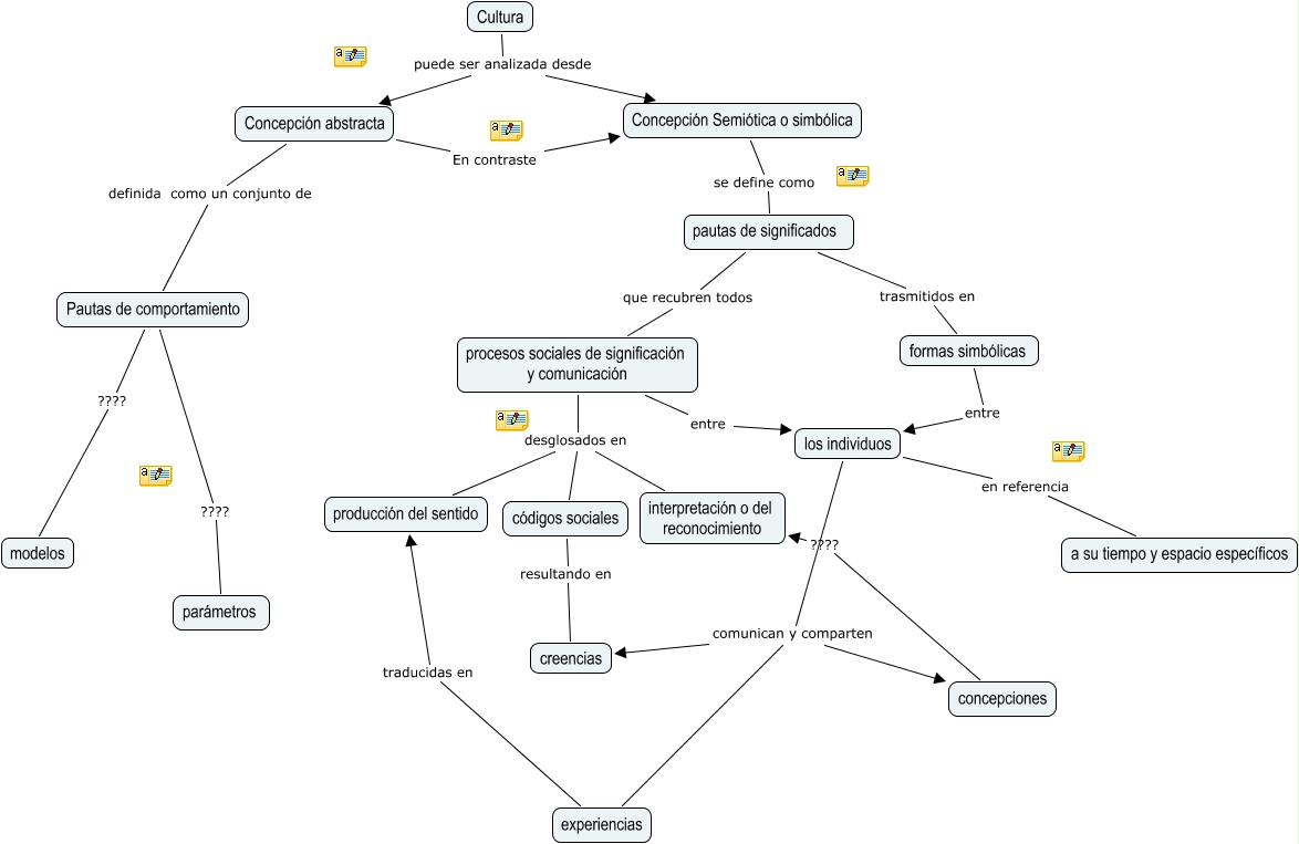 Este Cmap, tiene información relacionada con: La cutura como proceso simbólicoRevMAguilar, pautas de significados que recubren todos procesos sociales de significación y comunicación, Concepción abstracta En contraste Concepción Semiótica o simbólica, Cultura puede ser analizada desde Concepción abstracta, Cultura puede ser analizada desde Concepción Semiótica o simbólica, experiencias traducidas en producción del sentido, formas simbólicas entre los individuos, Pautas de comportamiento ???? parámetros, los individuos comunican y comparten concepciones, procesos sociales de significación y comunicación desglosados en producción del sentido, concepciones ???? interpretación o del reconocimiento, Concepción Semiótica o simbólica se define como pautas de significados, Concepción abstracta definida como un conjunto de Pautas de comportamiento, los individuos comunican y comparten creencias, Pautas de comportamiento ???? modelos, códigos sociales resultando en creencias, pautas de significados trasmitidos en formas simbólicas, los individuos en referencia a su tiempo y espacio específicos, procesos sociales de significación y comunicación desglosados en códigos sociales, procesos sociales de significación y comunicación desglosados en interpretación o del reconocimiento, procesos sociales de significación y comunicación entre los individuos