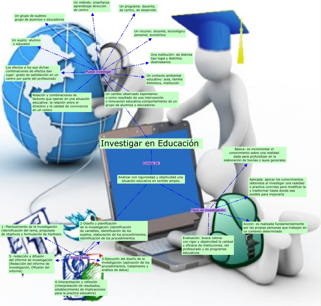 Este Cmap, tiene información relacionada con: Investigar en Educación, Investigar en Educación Puede investigar Un contexto ambiental educativo: aula, familia biblioteca, institución, Analizar con rigurosidad y objetividad una situación educativa en sentido amplio. Tipos de investigación Acción: es realizada fundamentalmente por las propias personas que trabajan en un contexto determinado, Investigar en Educación Puede investigar Relación y combinaciones de factores que operan en una situación educativa: la relación entre el directivo y la calidad de convivencia en un centro, Analizar con rigurosidad y objetividad una situación educativa en sentido amplio. Tiene Fases 3-Ejecución del diseño de la investigación (aplicación de los procedimientos, tratamiento y análisis de datos), Analizar con rigurosidad y objetividad una situación educativa en sentido amplio. Tipos de investigación Aplicada: aplicar los conocimientos obtenidos al investigar una realidad o practica concreta para modificar la y trasformar hasta donde sea posible para mejorarla, Investigar en Educación Puede investigar Los efectos a los que dichas combinaciones de efectos dan lugar: grado de satisfacción en un centro por parte del profesorado, Analizar con rigurosidad y objetividad una situación educativa en sentido amplio. Tiene Fases 2-Diseño y planificación de la investigación (identificación de variables, identificación de los sujetos, elaboración de los procedimientos, identificación de los procedimientos, Investigar en Educación Puede investigar Un cambio observado espontaneo o como resultado de una intervención o innovación educativa:comportamiento de un grupo de alumnos o educadores, Investigar en Educación Puede investigar Un programa: docente, de centro, de desarrollo, Investigar en Educación Puede investigar Un sujeto: alumno o educador, Analizar con rigurosidad y objetividad una situación educativa en sentido amplio. Tiene Fases 5- redacción y difusión del informe de investigación (Redacción del informe de investigación, Difusión del informe), Investigar en Educación Puede investigar Un grupo de sujetos: grupo de alumnos o educadores, Investigar en Educación Consta de Analizar con rigurosidad y objetividad una situación educativa en sentido amplio., Investigar en Educación Puede investigar Una institución: de distinta tipo logia y distintos destinatarios, Investigar en Educación Puede investigar Un recurso: docente, tecnológico personal, económico, Analizar con rigurosidad y objetividad una situación educativa en sentido amplio. Tiene Fases 4-Interpretación y reflexión (interpretación de resultados, establecimiento de implicaciones para la practica educativa), Analizar con rigurosidad y objetividad una situación educativa en sentido amplio. Tiene Fases 1- Planteamiento de la investigación (identificación del tema, propuesta de objetivos y formulación de hipótesis, Investigar en Educación Puede investigar Un método: enseñanza aprendizaje dirección de centro, Analizar con rigurosidad y objetividad una situación educativa en sentido amplio. Tipos de investigación Evaluación: busca valorar con rigor y objetividad la calidad y eficacia de instituciones, del profesorado y de programas educativos, Analizar con rigurosidad y objetividad una situación educativa en sentido amplio. Tipos de investigación Básica: es incrementar el conocimiento sobre una realidad dada para profundizar en la elaboración de teorías o leyes generales