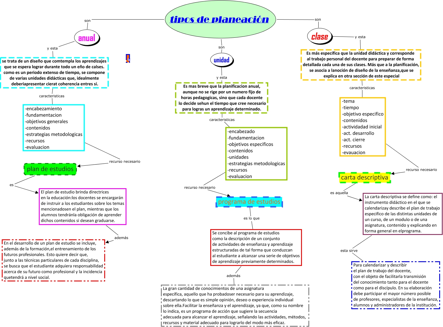 Este Cmap, tiene información relacionada con: TIPOS DE PLANEACION, El plan de estudio brinda directrices en la educación:los docentes se encargarán de instruir a los estudiantes sobre los temas mencionadosen el plan, mientras que los alumnos tendránla obligación de aprender dichos contenidos si desean graduarse. además En el desarrollo de un plan de estudio se incluye, además de la formación,el entrenamiento de los futuros profesionales. Esto quiere decir que, junto a las técnicas particulares de cada disciplina, se busca que el estudiante adquiera responsabilidad acerca de su futuro como profesional y la incidencia quetendrá a nivel social., tipos de planeación son clase, clase y esta Es más específica que la unidad didáctica y corresponde al trabajo personal del docente para preparar de forma detallada cada una de sus clases. Más que a la planificación, se asocia a lanoción de diseño de la enseñanza,que se explica en otra sección de este especial, unidad y esta Es mas breve que la planificacion anual, aunque no se rige por un numero fijo de horas pedagogicas, sino que cada docente lo decide sehun el tiempo que cree necesario para logras un aprendizaje determinado., programa de estudios es lo que Se concibe al programa de estudios como la descripción de un conjunto de actividades de enseñanza y aprendizaje estructuradas de tal forma que conduzcan al estudiante a alcanzar una serie de objetivos de aprendizaje previamente determinados., carta descriptiva es aquella La carta descriptiva se define como: el instrumento didáctico en el que se calendarizay describe el plan de trabajo especifico de las distintas unidades de un curso, de un modulo o de una asignatura, contenido y explicando en forma general en elprograma., tipos de planeación son unidad, se trata de un diseño que comtempla los aprendizajes que se espera lograr durante todo un eño de calses. como es un periodo extenso de tiempo, se compone de varias unidades didácticas que, idealmente deberiapresentar cierat coherencia entres sí. caracteristicas -encabezamiento -fundamentacion -objetivos generales -contenidos -estrategias metodologicas -recursos -evaluacion, tipos de planeación son anual, La carta descriptiva se define como: el instrumento didáctico en el que se calendarizay describe el plan de trabajo especifico de las distintas unidades de un curso, de un modulo o de una asignatura, contenido y explicando en forma general en elprograma. esta sirve Para calendarizar y describir el plan de trabajo del docente, con el objeto de facilitarla transmisión del conocimiento tanto para el docente como para el discípulo. En su elaboración debe participar el mayor número posible de profesores, especialistas de la enseñanza, alumnos y administradores de la institución., -encabezado -fundamentacion -objetivos especificos -contenidos -unidades -estrategias metodologicas -recursos -evaluacion recurso necesario programa de estudios, Es mas breve que la planificacion anual, aunque no se rige por un numero fijo de horas pedagogicas, sino que cada docente lo decide sehun el tiempo que cree necesario para logras un aprendizaje determinado. caracteristicas -encabezado -fundamentacion -objetivos especificos -contenidos -unidades -estrategias metodologicas -recursos -evaluacion, anual y esta se trata de un diseño que comtempla los aprendizajes que se espera lograr durante todo un eño de calses. como es un periodo extenso de tiempo, se compone de varias unidades didácticas que, idealmente deberiapresentar cierat coherencia entres sí., -encabezamiento -fundamentacion -objetivos generales -contenidos -estrategias metodologicas -recursos -evaluacion recurso necesario plan de estudios, Es más específica que la unidad didáctica y corresponde al trabajo personal del docente para preparar de forma detallada cada una de sus clases. Más que a la planificación, se asocia a lanoción de diseño de la enseñanza,que se explica en otra sección de este especial caracteristicas -tema -tiempo -objetivo especifico -contenidos -actividadad inicial -act. desarrollo -act. cierre -recursos -evauacion, -tema -tiempo -objetivo especifico -contenidos -actividadad inicial -act. desarrollo -act. cierre -recursos -evauacion recurso necesario carta descriptiva, Se concibe al programa de estudios como la descripción de un conjunto de actividades de enseñanza y aprendizaje estructuradas de tal forma que conduzcan al estudiante a alcanzar una serie de objetivos de aprendizaje previamente determinados. además La gran cantidad de conocimientos de una asignatura específica, aquello que ha probadoser necesario para su aprendizaje, descartando lo que es simple opinión, deseo o experiencia individual sobre ella.Facilitar la enseñanza y el aprendizaje, ya que, como su nombre lo indica, es un programa de acción que sugiere la secuencia adecuada para alcanzar el aprendizaje, señalando las actividades, métodos, recursos y material adecuado para lograrlo del modo más eficaz., plan de estudios es El plan de estudio brinda directrices en la educación:los docentes se encargarán de instruir a los estudiantes sobre los temas mencionadosen el plan, mientras que los alumnos tendránla obligación de aprender dichos contenidos si desean graduarse.
