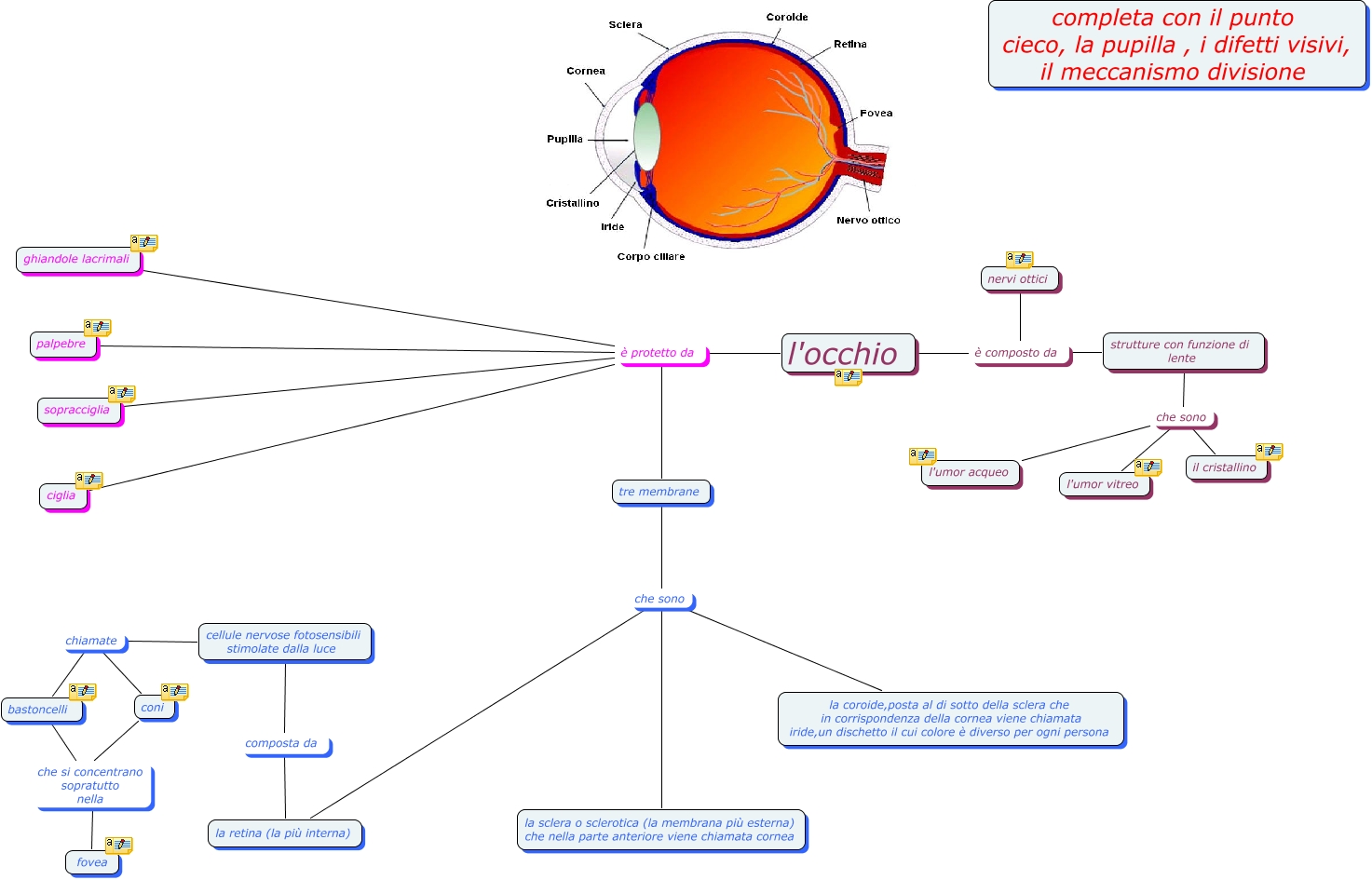 Questa Cmap, creata con IHMC CmapTools, contiene informazioni relative a: l'occhio, l'occhio è protetto da tre membrane, tre membrane che sono la sclera o sclerotica (la membrana più esterna) che nella parte anteriore viene chiamata cornea, l'occhio è protetto da ciglia, l'occhio è composto da nervi ottici, coni che si concentrano sopratutto nella fovea, strutture con funzione di lente che sono il cristallino, l'occhio è composto da strutture con funzione di lente, l'occhio è protetto da ghiandole lacrimali, l'occhio è protetto da palpebre, cellule nervose fotosensibili stimolate dalla luce chiamate bastoncelli, cellule nervose fotosensibili stimolate dalla luce chiamate coni, strutture con funzione di lente che sono l'umor acqueo, bastoncelli che si concentrano sopratutto nella fovea, tre membrane che sono la retina (la più interna), la retina (la più interna) composta da cellule nervose fotosensibili stimolate dalla luce, l'occhio è protetto da sopracciglia, tre membrane che sono la coroide,posta al di sotto della sclera che in corrispondenza della cornea viene chiamata iride,un dischetto il cui colore è diverso per ogni persona, strutture con funzione di lente che sono l'umor vitreo
