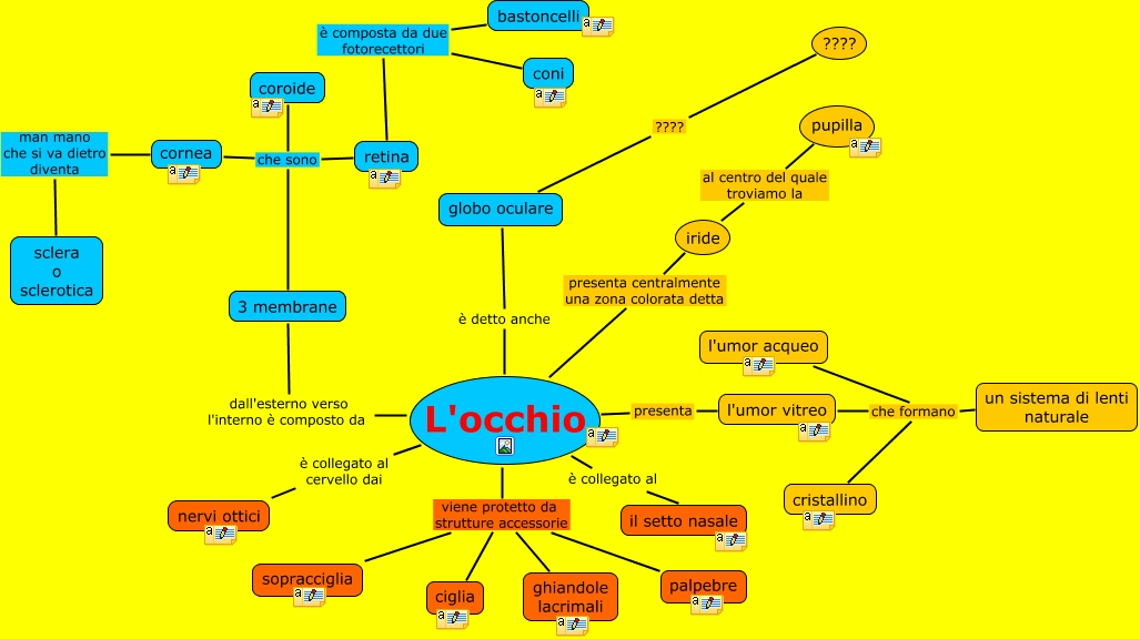 Questa Cmap, creata con IHMC CmapTools, contiene informazioni relative a: l'occhio, retina è composta da due fotorecettori coni, L'occhio viene protetto da strutture accessorie ghiandole lacrimali, retina è composta da due fotorecettori bastoncelli, cristallino che formano un sistema di lenti naturale, L'occhio è collegato al cervello dai nervi ottici, L'occhio viene protetto da strutture accessorie ciglia, l'umor acqueo che formano un sistema di lenti naturale, 3 membrane che sono coroide, cornea man mano che si va dietro diventa sclera o sclerotica, iride al centro del quale troviamo la pupilla, globo oculare ???? ????, l'umor vitreo che formano un sistema di lenti naturale, L'occhio è collegato al il setto nasale, l'umor vitreo presenta L'occhio, L'occhio viene protetto da strutture accessorie sopracciglia, L'occhio viene protetto da strutture accessorie palpebre, 3 membrane che sono cornea, L'occhio è detto anche globo oculare, L'occhio dall'esterno verso l'interno è composto da 3 membrane, L'occhio presenta centralmente una zona colorata detta iride
