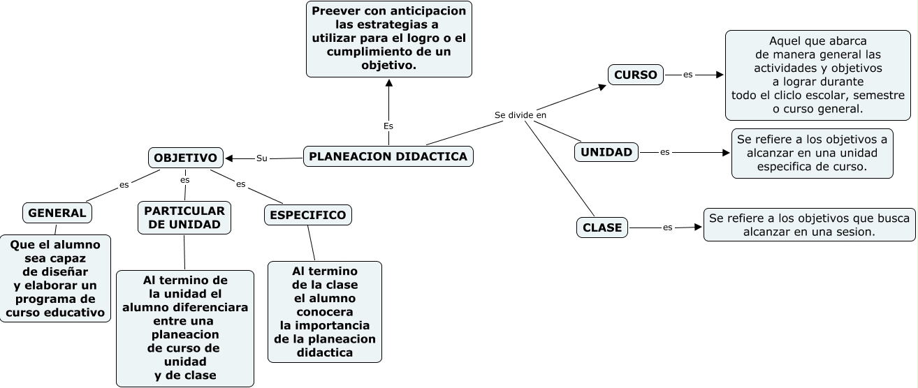 Este Cmap, tiene información relacionada con: PLANEACION DIDACTICA, PLANEACION DIDACTICA Es Preever con anticipacion las estrategias a utilizar para el logro o el cumplimiento de un objetivo., CURSO es Aquel que abarca de manera general las actividades y objetivos a lograr durante todo el cliclo escolar, semestre o curso general., ESPECIFICO ???? Al termino de la clase el alumno conocera la importancia de la planeacion didactica, PLANEACION DIDACTICA Su OBJETIVO, UNIDAD es Se refiere a los objetivos a alcanzar en una unidad especifica de curso., PLANEACION DIDACTICA Se divide en CLASE, PLANEACION DIDACTICA Se divide en CURSO, OBJETIVO es GENERAL, PARTICULAR DE UNIDAD ???? Al termino de la unidad el alumno diferenciara entre una planeacion de curso de unidad y de clase, OBJETIVO es PARTICULAR DE UNIDAD, CLASE es Se refiere a los objetivos que busca alcanzar en una sesion., PLANEACION DIDACTICA Se divide en UNIDAD, GENERAL ???? Que el alumno sea capaz de diseñar y elaborar un programa de curso educativo, OBJETIVO es ESPECIFICO