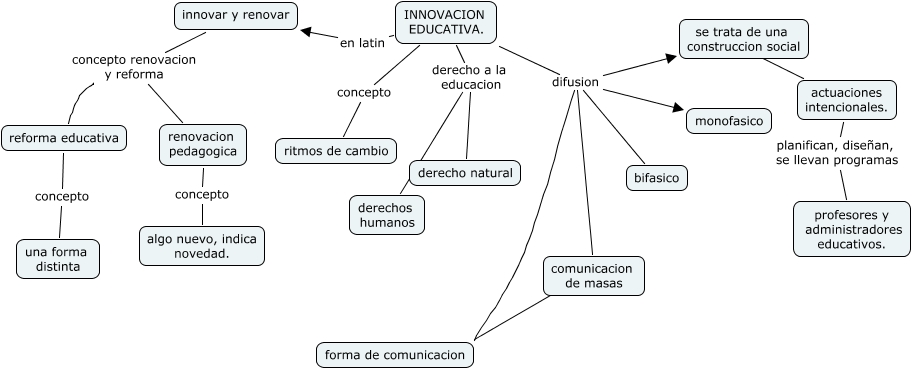 Este Cmap, tiene información relacionada con: innovacion educativa, INNOVACION EDUCATIVA. difusion monofasico, actuaciones intencionales. planifican, diseñan, se llevan programas profesores y administradores educativos., INNOVACION EDUCATIVA. difusion forma de comunicacion, INNOVACION EDUCATIVA. concepto ritmos de cambio, INNOVACION EDUCATIVA. derecho a la educacion derecho natural, se trata de una construccion social ???? actuaciones intencionales., renovacion pedagogica concepto algo nuevo, indica novedad., innovar y renovar concepto renovacion y reforma renovacion pedagogica, INNOVACION EDUCATIVA. en latin innovar y renovar, forma de comunicacion ???? ????, INNOVACION EDUCATIVA. difusion se trata de una construccion social, INNOVACION EDUCATIVA. difusion comunicacion de masas, INNOVACION EDUCATIVA. derecho a la educacion derechos humanos, reforma educativa concepto una forma distinta, innovar y renovar concepto renovacion y reforma reforma educativa, INNOVACION EDUCATIVA. difusion bifasico