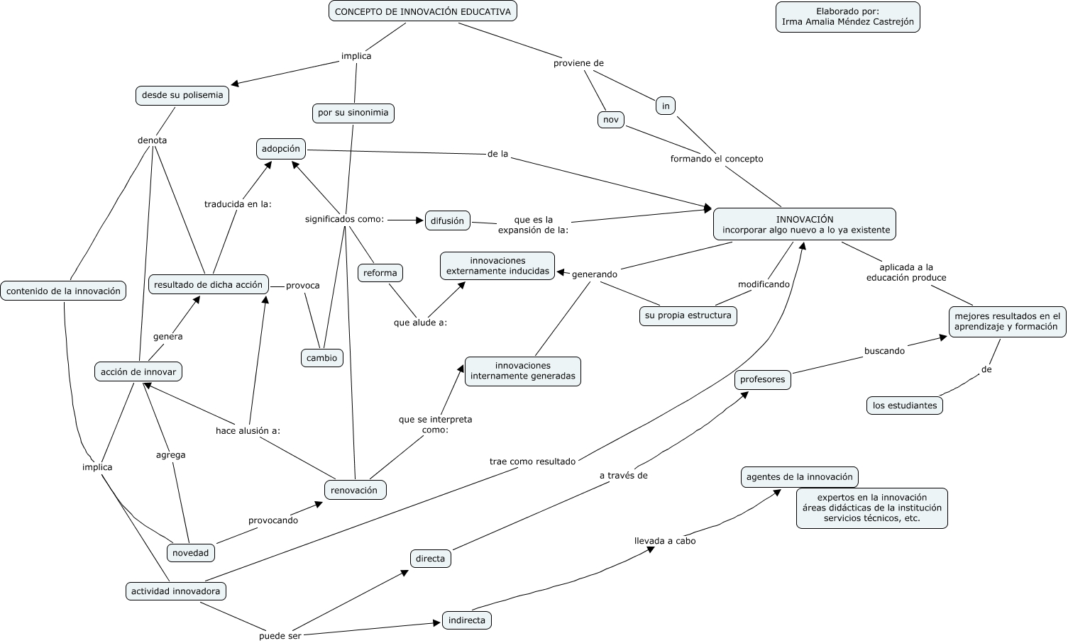 Este Cmap, tiene información relacionada con: La innovación educativa, CONCEPTO DE INNOVACIÓN EDUCATIVA implica desde su polisemia, nov formando el concepto INNOVACIÓN incorporar algo nuevo a lo ya existente, por su sinonimia significados como: adopción, reforma que alude a: innovaciones externamente inducidas, INNOVACIÓN incorporar algo nuevo a lo ya existente modificando su propia estructura, mejores resultados en el aprendizaje y formación de los estudiantes, desde su polisemia denota acción de innovar, por su sinonimia significados como: difusión, actividad innovadora puede ser indirecta, acción de innovar agrega novedad, novedad provocando renovación, resultado de dicha acción traducida en la: adopción, difusión que es la expansión de la: INNOVACIÓN incorporar algo nuevo a lo ya existente, adopción de la INNOVACIÓN incorporar algo nuevo a lo ya existente, por su sinonimia significados como: renovación, actividad innovadora puede ser directa, renovación hace alusión a: resultado de dicha acción, indirecta llevada a cabo agentes de la innovación, INNOVACIÓN incorporar algo nuevo a lo ya existente aplicada a la educación produce mejores resultados en el aprendizaje y formación, acción de innovar genera resultado de dicha acción