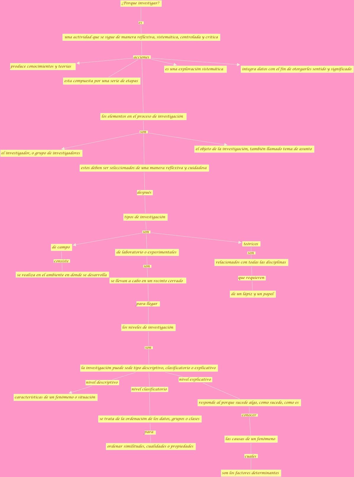 Este Cmap, tiene información relacionada con: investigacion, la investigación puede sede tipo descriptivo, clasificatorio o explicativo nivel clasificatorio se trata de la ordenación de los datos, grupos o clases, las causas de un fenómeno cuales son los factores determinantes, teóricos son relacionados con todas las disciplinas, de campo consiste se realiza en el ambiente en donde se desarrolla, los elementos en el proceso de investigación son estos deben ser seleccionados de una manera reflexiva y cuidadosa, una actividad que se sigue de manera reflexiva, sistemática, controlada y critica acciones esta compuesta por una serie de etapas, tipos de investigación son de laboratorio o experimentales, de laboratorio o experimentales son se llevan a cabo en un recinto cerrado, relacionados con todas las disciplinas que requieren de un lápiz y un papel, una actividad que se sigue de manera reflexiva, sistemática, controlada y critica acciones es una exploración sistemática, los elementos en el proceso de investigación son el investigador, o grupo de investigadores, responde al porque sucede algo, como sucede, como es conocer las causas de un fenómeno, los elementos en el proceso de investigación son el objeto de la investigación, también llamado tema de asunto, tipos de investigación son teóricos, la investigación puede sede tipo descriptivo, clasificatorio o explicativo nivel explicativo responde al porque sucede algo, como sucede, como es, los niveles de investigación son la investigación puede sede tipo descriptivo, clasificatorio o explicativo, la investigación puede sede tipo descriptivo, clasificatorio o explicativo nivel descriptivo características de un fenómeno o situación, una actividad que se sigue de manera reflexiva, sistemática, controlada y critica acciones produce conocimientos y teorías, ¿Porque investigar? es una actividad que se sigue de manera reflexiva, sistemática, controlada y critica, una actividad que se sigue de manera reflexiva, sistemática, controlada y critica acciones integra datos con el fin de otorgarles sentido y significado