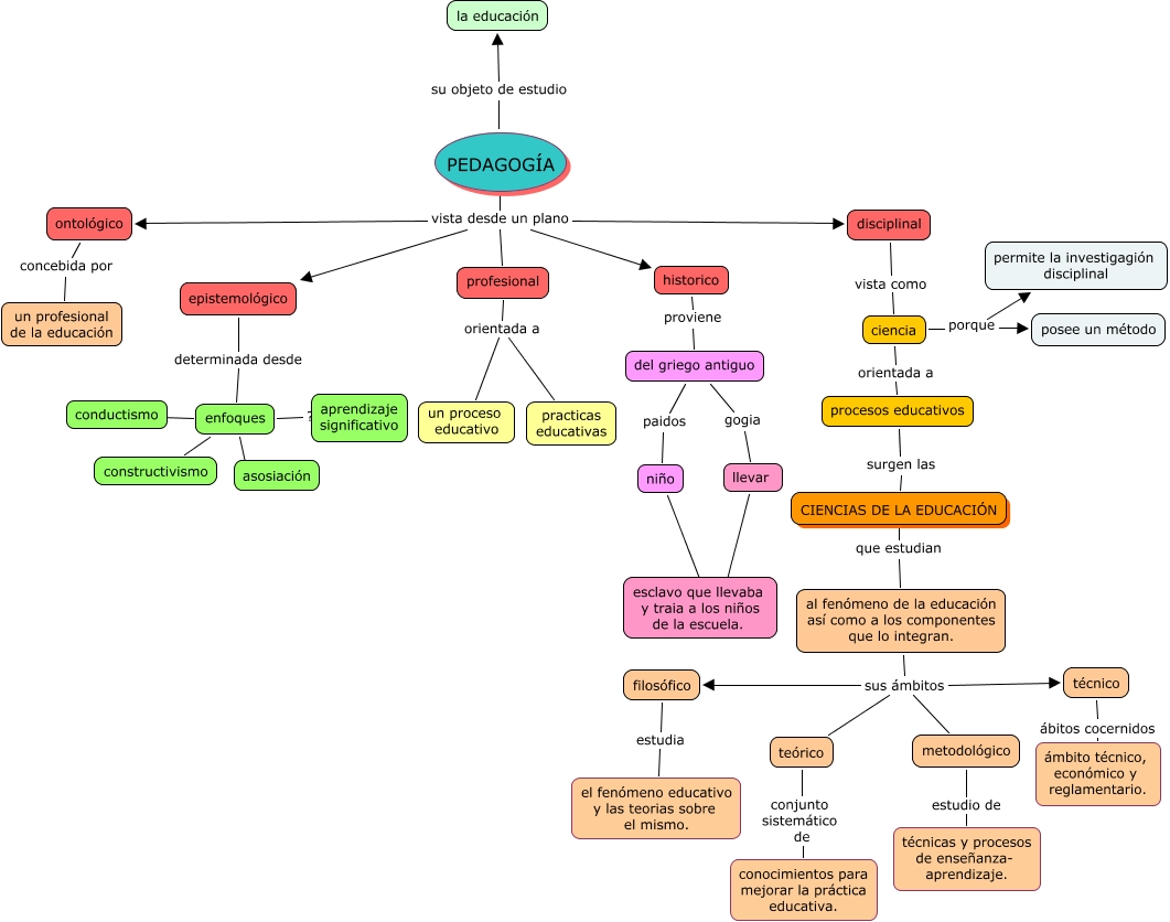 Este Cmap, tiene información relacionada con: pedagogía, PEDAGOGÍA vista desde un plano historico, ontológico concebida por un profesional de la educación, historico proviene del griego antiguo, enfoques ???? constructivismo, al fenómeno de la educación así como a los componentes que lo integran. sus ámbitos teórico, disciplinal vista como ciencia, al fenómeno de la educación así como a los componentes que lo integran. sus ámbitos filosófico, enfoques ???? asosiación, niño ???? esclavo que llevaba y traia a los niños de la escuela., filosófico estudia el fenómeno educativo y las teorias sobre el mismo., procesos educativos surgen las CIENCIAS DE LA EDUCACIÓN, CIENCIAS DE LA EDUCACIÓN que estudian al fenómeno de la educación así como a los componentes que lo integran., profesional orientada a un proceso educativo, ciencia orientada a procesos educativos, PEDAGOGÍA vista desde un plano profesional, PEDAGOGÍA vista desde un plano ontológico, al fenómeno de la educación así como a los componentes que lo integran. sus ámbitos técnico, ciencia porque posee un método, metodológico estudio de técnicas y procesos de enseñanza- aprendizaje., teórico conjunto sistemático de conocimientos para mejorar la práctica educativa.