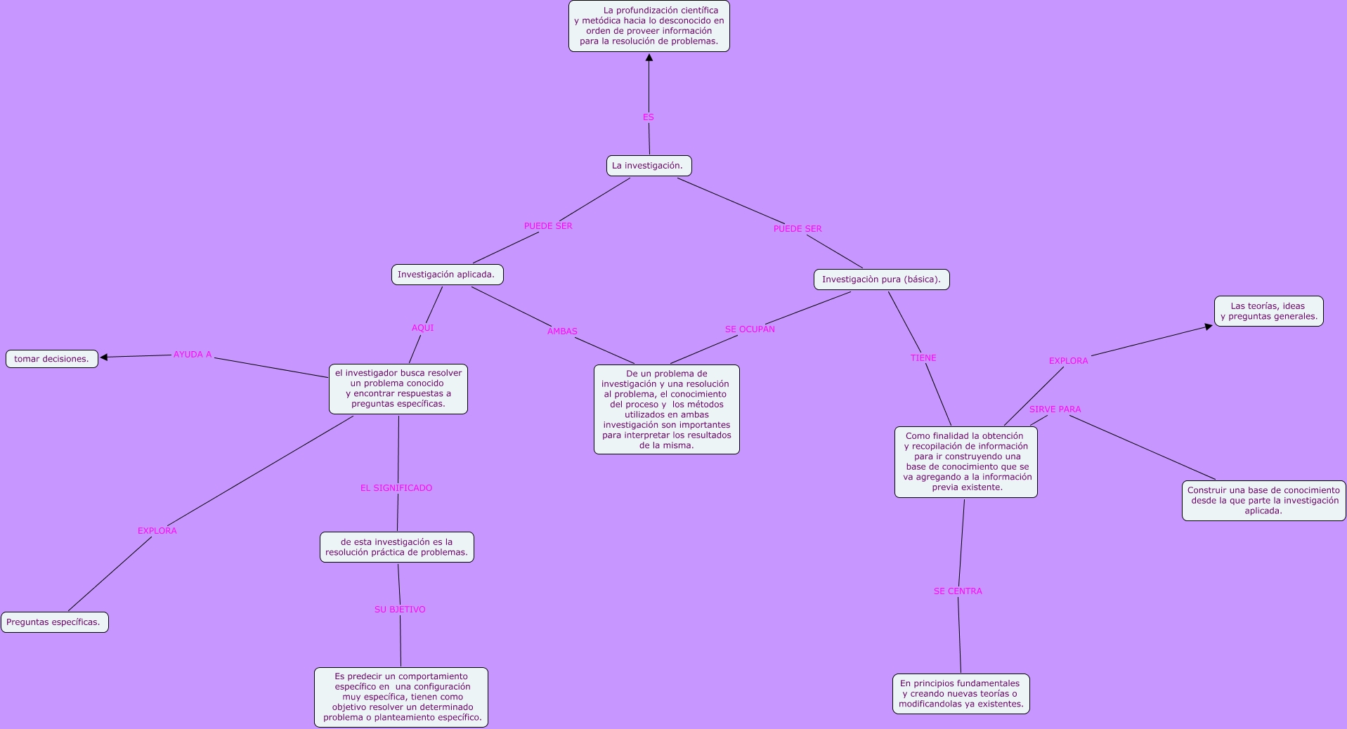Este Cmap, tiene información relacionada con: INV. APLICADA VS PURA, el investigador busca resolver un problema conocido y encontrar respuestas a preguntas específicas. AYUDA A tomar decisiones., el investigador busca resolver un problema conocido y encontrar respuestas a preguntas específicas. EL SIGNIFICADO de esta investigación es la resolución práctica de problemas., Como finalidad la obtención y recopilación de información para ir construyendo una base de conocimiento que se va agregando a la información previa existente. SIRVE PARA Construir una base de conocimiento desde la que parte la investigación aplicada., de esta investigación es la resolución práctica de problemas. SU BJETIVO Es predecir un comportamiento específico en una configuración muy específica, tienen como objetivo resolver un determinado problema o planteamiento específico., Investigaciòn pura (básica). SE OCUPAN De un problema de investigación y una resolución al problema, el conocimiento del proceso y los métodos utilizados en ambas investigación son importantes para interpretar los resultados de la misma., Investigaciòn pura (básica). TIENE Como finalidad la obtención y recopilación de información para ir construyendo una base de conocimiento que se va agregando a la información previa existente., Como finalidad la obtención y recopilación de información para ir construyendo una base de conocimiento que se va agregando a la información previa existente. EXPLORA Las teorías, ideas y preguntas generales., La investigación. PUEDE SER Investigaciòn pura (básica)., Como finalidad la obtención y recopilación de información para ir construyendo una base de conocimiento que se va agregando a la información previa existente. SE CENTRA En principios fundamentales y creando nuevas teorías o modificandolas ya existentes., Investigación aplicada. AMBAS De un problema de investigación y una resolución al problema, el conocimiento del proceso y los métodos utilizados en ambas investigación son importantes para interpretar los resultados de la misma., el investigador busca resolver un problema conocido y encontrar respuestas a preguntas específicas. EXPLORA Preguntas específicas., La investigación. ES La profundización científica y metódica hacia lo desconocido en orden de proveer información para la resolución de problemas., Investigación aplicada. AQUI el investigador busca resolver un problema conocido y encontrar respuestas a preguntas específicas., La investigación. PUEDE SER Investigación aplicada.