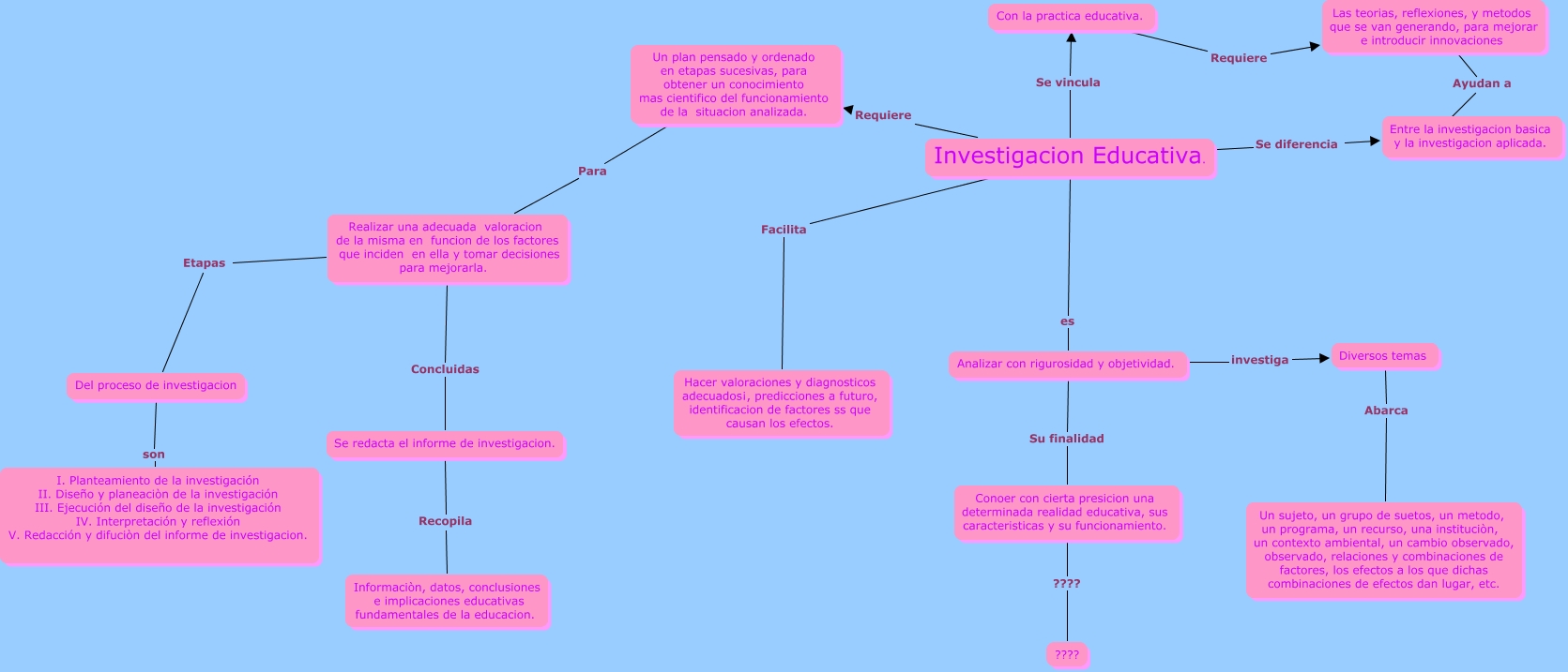 Este Cmap, tiene información relacionada con: INVESTIGACIÒN EDUCATIVA, Conoer con cierta presicion una determinada realidad educativa, sus caracteristicas y su funcionamiento. ???? ????, Investigacion Educativa. Se diferencia Entre la investigacion basica y la investigacion aplicada., Analizar con rigurosidad y objetividad. Su finalidad Conoer con cierta presicion una determinada realidad educativa, sus caracteristicas y su funcionamiento., Se redacta el informe de investigacion. Recopila Informaciòn, datos, conclusiones e implicaciones educativas fundamentales de la educacion., Del proceso de investigacion son I. Planteamiento de la investigación II. Diseño y planeaciòn de la investigación III. Ejecución del diseño de la investigación IV. Interpretación y reflexión V. Redacción y difuciòn del informe de investigacion., Investigacion Educativa. Facilita Hacer valoraciones y diagnosticos adecuados¡, predicciones a futuro, identificacion de factores ss que causan los efectos., Un plan pensado y ordenado en etapas sucesivas, para obtener un conocimiento mas cientifico del funcionamiento de la situacion analizada. Para Realizar una adecuada valoracion de la misma en funcion de los factores que inciden en ella y tomar decisiones para mejorarla., Investigacion Educativa. Se vincula Con la practica educativa., Analizar con rigurosidad y objetividad. investiga Diversos temas, Con la practica educativa. Requiere Las teorias, reflexiones, y metodos que se van generando, para mejorar e introducir innovaciones, Realizar una adecuada valoracion de la misma en funcion de los factores que inciden en ella y tomar decisiones para mejorarla. Etapas Del proceso de investigacion, Realizar una adecuada valoracion de la misma en funcion de los factores que inciden en ella y tomar decisiones para mejorarla. Concluidas Se redacta el informe de investigacion., Diversos temas Abarca Un sujeto, un grupo de suetos, un metodo, un programa, un recurso, una instituciòn, un contexto ambiental, un cambio observado, observado, relaciones y combinaciones de factores, los efectos a los que dichas combinaciones de efectos dan lugar, etc., Investigacion Educativa. Requiere Un plan pensado y ordenado en etapas sucesivas, para obtener un conocimiento mas cientifico del funcionamiento de la situacion analizada., Las teorias, reflexiones, y metodos que se van generando, para mejorar e introducir innovaciones Ayudan a ????, Investigacion Educativa. es Analizar con rigurosidad y objetividad.