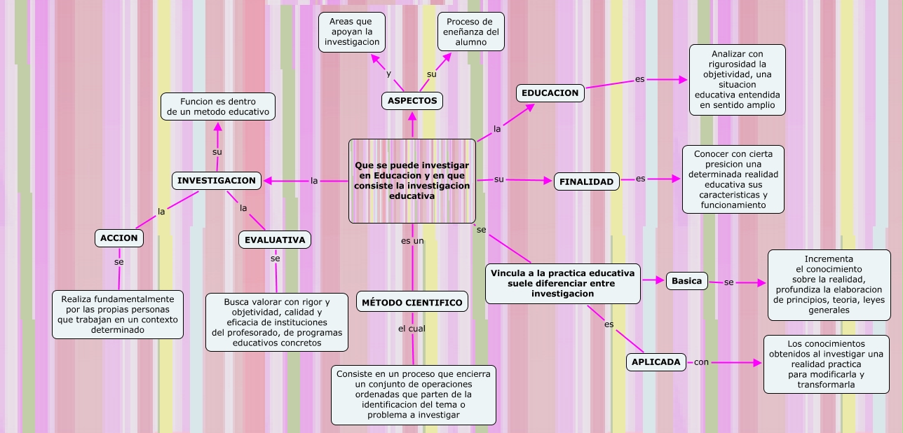 Este Cmap, tiene información relacionada con: INVESTIGACION, Basica se Incrementa el conocimiento sobre la realidad, profundiza la elaboracion de principios, teoria, leyes generales, ACCION se Realiza fundamentalmente por las propias personas que trabajan en un contexto determinado, EDUCACION es Analizar con rigurosidad la objetividad, una situacion educativa entendida en sentido amplio, Vincula a la practica educativa suele diferenciar entre investigacion ???? Basica, ASPECTOS y Areas que apoyan la investigacion, Vincula a la practica educativa suele diferenciar entre investigacion es APLICADA, Que se puede investigar en Educacion y en que consiste la investigacion educativa es un MÉTODO CIENTIFICO, Que se puede investigar en Educacion y en que consiste la investigacion educativa son ASPECTOS, Que se puede investigar en Educacion y en que consiste la investigacion educativa se Vincula a la practica educativa suele diferenciar entre investigacion, Que se puede investigar en Educacion y en que consiste la investigacion educativa su FINALIDAD, MÉTODO CIENTIFICO el cual Consiste en un proceso que encierra un conjunto de operaciones ordenadas que parten de la identificacion del tema o problema a investigar, INVESTIGACION su Funcion es dentro de un metodo educativo, Que se puede investigar en Educacion y en que consiste la investigacion educativa la INVESTIGACION, INVESTIGACION la EVALUATIVA, FINALIDAD es Conocer con cierta presicion una determinada realidad educativa sus caracteristicas y funcionamiento, INVESTIGACION la ACCION, APLICADA con Los conocimientos obtenidos al investigar una realidad practica para modificarla y transformarla, Que se puede investigar en Educacion y en que consiste la investigacion educativa la EDUCACION, EVALUATIVA se Busca valorar con rigor y objetividad, calidad y eficacia de instituciones del profesorado, de programas educativos concretos, ASPECTOS su Proceso de eneñanza del alumno