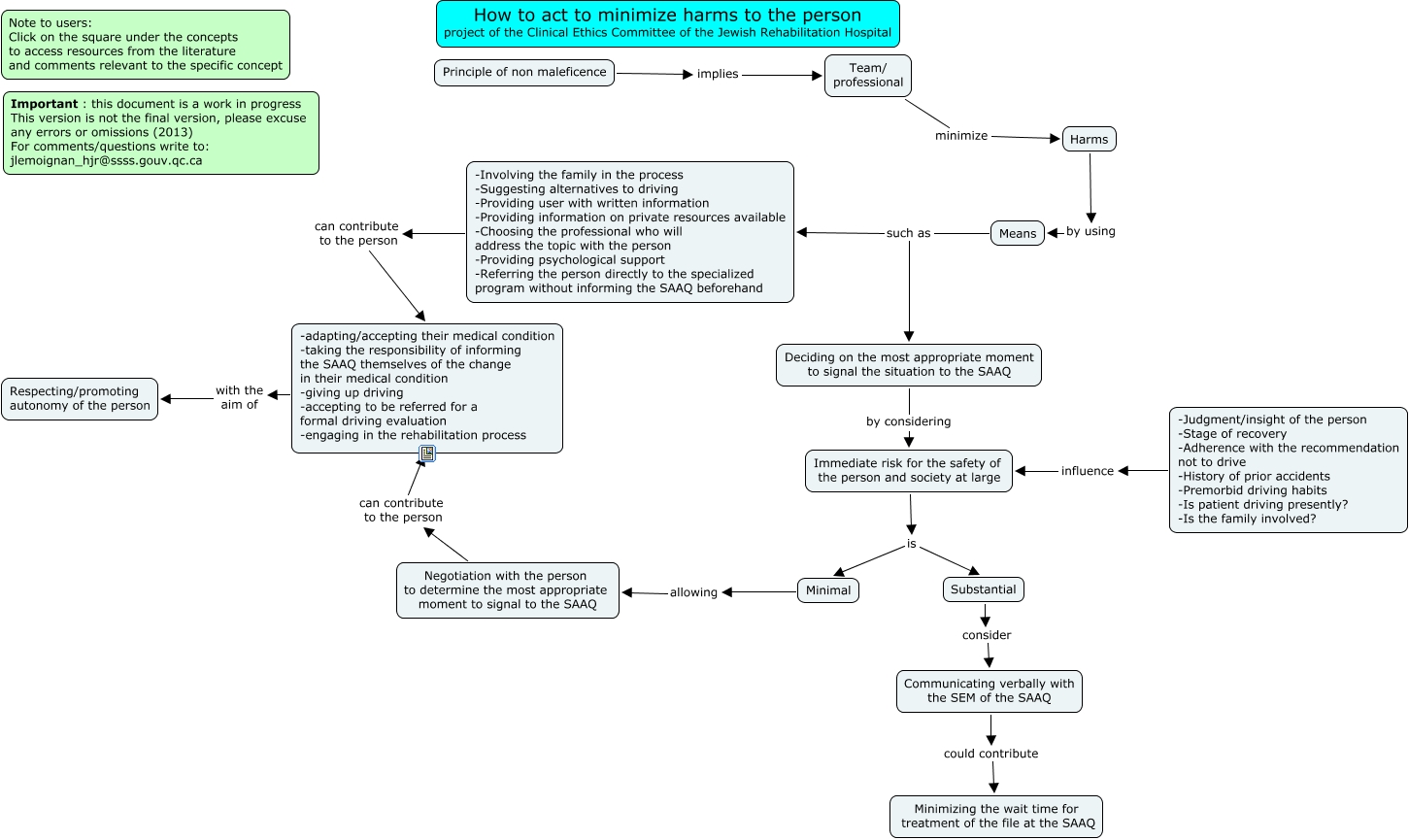 Cette carte de concepts créée avec IHMC CmapTools traite de: how to min. harms11 sept eng, Team/ professional minimize Harms, Deciding on the most appropriate moment to signal the situation to the SAAQ by considering Immediate risk for the safety of the person and society at large, Means such as Deciding on the most appropriate moment to signal the situation to the SAAQ, Immediate risk for the safety of the person and society at large is Substantial, Negotiation with the person to determine the most appropriate moment to signal to the SAAQ can contribute to the person -adapting/accepting their medical condition -taking the responsibility of informing the SAAQ themselves of the change in their medical condition -giving up driving -accepting to be referred for a formal driving evaluation -engaging in the rehabilitation process, Substantial consider Communicating verbally with the SEM of the SAAQ, -Judgment/insight of the person -Stage of recovery -Adherence with the recommendation not to drive -History of prior accidents -Premorbid driving habits -Is patient driving presently? -Is the family involved? influence Immediate risk for the safety of the person and society at large, Principle of non maleficence implies Team/ professional, Immediate risk for the safety of the person and society at large is Minimal, Harms by using Means, Communicating verbally with the SEM of the SAAQ could contribute Minimizing the wait time for treatment of the file at the SAAQ, Means such as -Involving the family in the process -Suggesting alternatives to driving -Providing user with written information -Providing information on private resources available -Choosing the professional who will address the topic with the person -Providing psychological support -Referring the person directly to the specialized program without informing the SAAQ beforehand, -adapting/accepting their medical condition -taking the responsibility of informing the SAAQ themselves of the change in their medical condition -giving up driving -accepting to be referred for a formal driving evaluation -engaging in the rehabilitation process with the aim of Respecting/promoting autonomy of the person, Minimal allowing Negotiation with the person to determine the most appropriate moment to signal to the SAAQ, -Involving the family in the process -Suggesting alternatives to driving -Providing user with written information -Providing information on private resources available -Choosing the professional who will address the topic with the person -Providing psychological support -Referring the person directly to the specialized program without informing the SAAQ beforehand can contribute to the person -adapting/accepting their medical condition -taking the responsibility of informing the SAAQ themselves of the change in their medical condition -giving up driving -accepting to be referred for a formal driving evaluation -engaging in the rehabilitation process