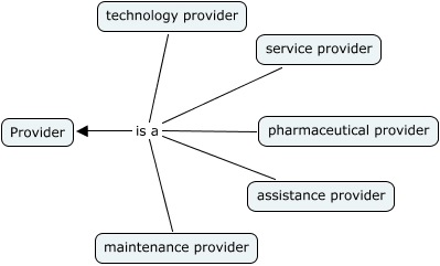 Questa Cmap, creata con IHMC CmapTools, contiene informazioni relative a: Actors-providers, pharmaceutical provider is a Provider, service provider is a Provider, maintenance provider is a Provider, technology provider is a Provider, assistance provider is a Provider
