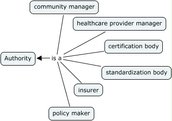 Questa Cmap, creata con IHMC CmapTools, contiene informazioni relative a: Actors-authority, certification body is a Authority, standardization body is a Authority, policy maker is a Authority, insurer is a Authority, community manager is a Authority, healthcare provider manager is a Authority