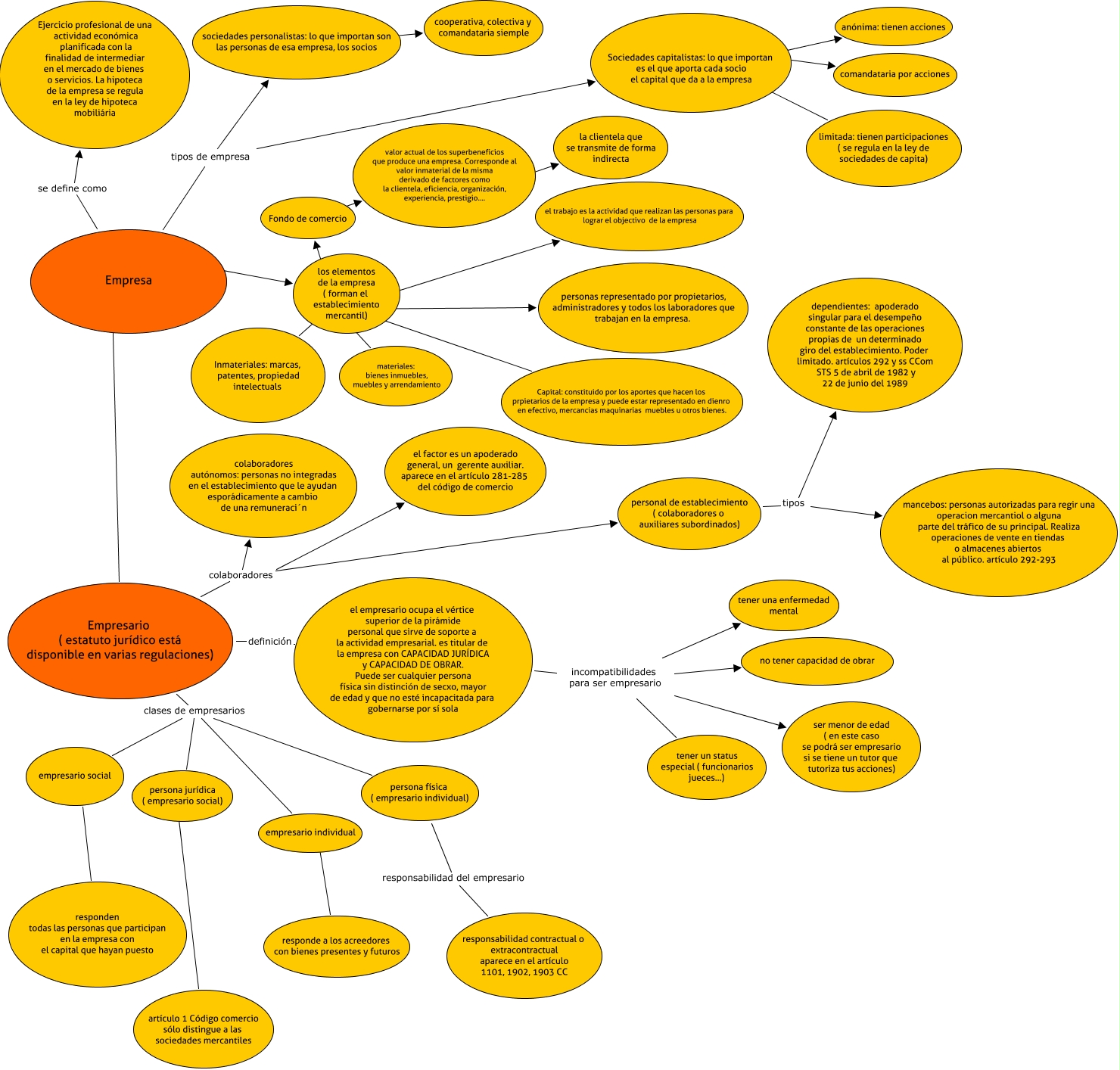 Este Cmap, tiene información relacionada con: escenari 1 (laura), Sociedades capitalistas: lo que importan es el que aporta cada socio el capital que da a la empresa ???? comandataria por acciones, persona física ( empresario individual) responsabilidad del empresario responsabilidad contractual o extracontractual aparece en el artículo 1101, 1902, 1903 CC, los elementos de la empresa ( forman el establecimiento mercantil) ???? Fondo de comercio, Empresario ( estatuto jurídico está disponible en varias regulaciones) definición el empresario ocupa el vértice superior de la pirámide personal que sirve de soporte a la actividad empresarial. es titular de la empresa con CAPACIDAD JURÍDICA y CAPACIDAD DE OBRAR. Puede ser cualquier persona física sin distinción de secxo, mayor de edad y que no esté incapacitada para gobernarse por sí sola, empresario individual ???? responde a los acreedores con bienes presentes y futuros, los elementos de la empresa ( forman el establecimiento mercantil) ???? materiales: bienes inmuebles, muebles y arrendamiento, Empresario ( estatuto jurídico está disponible en varias regulaciones) colaboradores personal de establecimiento ( colaboradores o auxiliares subordinados), Sociedades capitalistas: lo que importan es el que aporta cada socio el capital que da a la empresa ???? limitada: tienen participaciones ( se regula en la ley de sociedades de capita), Empresario ( estatuto jurídico está disponible en varias regulaciones) clases de empresarios empresario social, Empresa ???? los elementos de la empresa ( forman el establecimiento mercantil), Empresa se define como Ejercicio profesional de una actividad económica planificada con la finalidad de intermediar en el mercado de bienes o servicios. La hipoteca de la empresa se regula en la ley de hipoteca mobiliária, valor actual de los superbeneficios que produce una empresa. Corresponde al valor inmaterial de la misma derivado de factores como la clientela, eficiencia, organización, experiencia, prestigio.... ???? la clientela que se transmite de forma indirecta, persona jurídica ( empresario social) ???? artículo 1 Código comercio sólo distingue a las sociedades mercantiles, los elementos de la empresa ( forman el establecimiento mercantil) ???? Inmateriales: marcas, patentes, propiedad intelectuals, Empresa ???? Empresario ( estatuto jurídico está disponible en varias regulaciones), los elementos de la empresa ( forman el establecimiento mercantil) ???? el trabajo es la actividad que realizan las personas para lograr el objectivo de la empresa, sociedades personalistas: lo que importan son las personas de esa empresa, los socios ???? cooperativa, colectiva y comandataria siemple, empresario social ???? responden todas las personas que participan en la empresa con el capital que hayan puesto, Sociedades capitalistas: lo que importan es el que aporta cada socio el capital que da a la empresa ???? anónima: tienen acciones, Empresario ( estatuto jurídico está disponible en varias regulaciones) colaboradores el factor es un apoderado general, un gerente auxiliar. aparece en el artículo 281-285 del código de comercio
