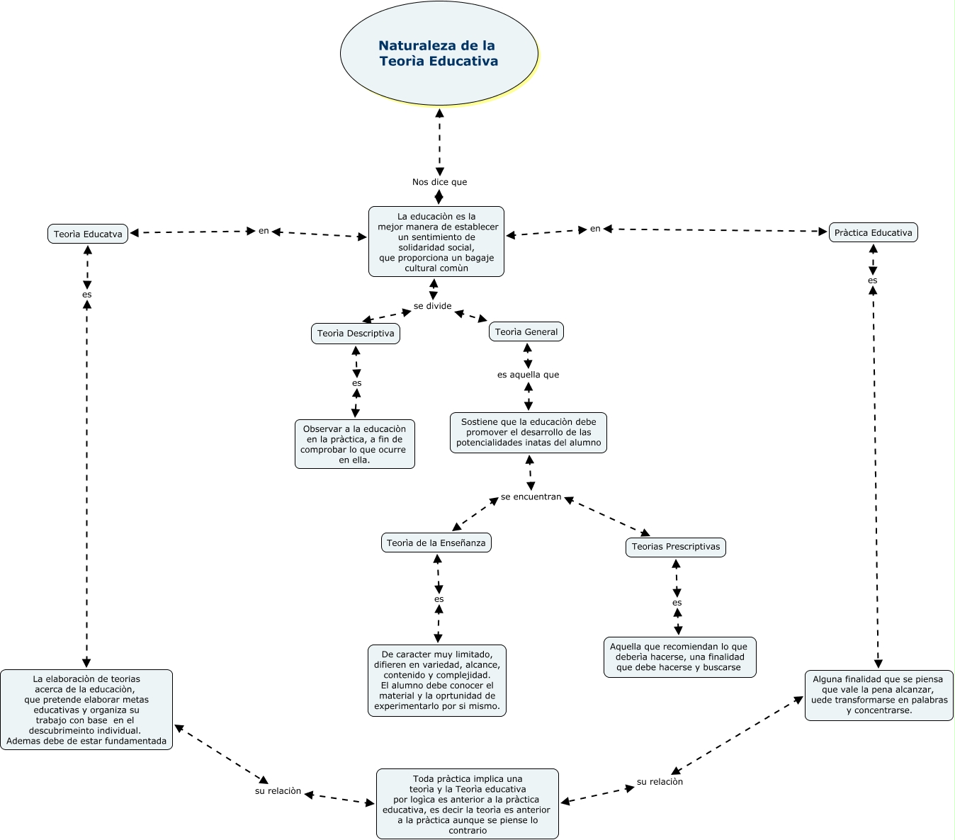 Este Cmap, tiene información relacionada con: Naturaleza de la Teorìa Educativa, La educaciòn es la mejor manera de establecer un sentimiento de solidaridad social, que proporciona un bagaje cultural comùn se divide Teorìa General, Pràctica Educativa es Alguna finalidad que se piensa que vale la pena alcanzar, uede transformarse en palabras y concentrarse., Teorias Prescriptivas es Aquella que recomiendan lo que deberìa hacerse, una finalidad que debe hacerse y buscarse, La elaboraciòn de teorias acerca de la educaciòn, que pretende elaborar metas educativas y organiza su trabajo con base en el descubrimeinto individual. Ademas debe de estar fundamentada su relaciòn Toda pràctica implica una teorìa y la Teorìa educativa por logìca es anterior a la pràctica educativa, es decir la teorìa es anterior a la pràctica aunque se piense lo contrario, Naturaleza de la Teorìa Educativa Nos dice que La educaciòn es la mejor manera de establecer un sentimiento de solidaridad social, que proporciona un bagaje cultural comùn, Teorìa Descriptiva es Observar a la educaciòn en la pràctica, a fin de comprobar lo que ocurre en ella., Teorìa de la Enseñanza es De caracter muy limitado, difieren en variedad, alcance, contenido y complejidad. El alumno debe conocer el material y la oprtunidad de experimentarlo por si mismo., La educaciòn es la mejor manera de establecer un sentimiento de solidaridad social, que proporciona un bagaje cultural comùn se divide Teorìa Descriptiva, La educaciòn es la mejor manera de establecer un sentimiento de solidaridad social, que proporciona un bagaje cultural comùn en Pràctica Educativa, Alguna finalidad que se piensa que vale la pena alcanzar, uede transformarse en palabras y concentrarse. su relaciòn Toda pràctica implica una teorìa y la Teorìa educativa por logìca es anterior a la pràctica educativa, es decir la teorìa es anterior a la pràctica aunque se piense lo contrario, La educaciòn es la mejor manera de establecer un sentimiento de solidaridad social, que proporciona un bagaje cultural comùn en Teorìa Educatva, Teorìa General es aquella que Sostiene que la educaciòn debe promover el desarrollo de las potencialidades inatas del alumno, Sostiene que la educaciòn debe promover el desarrollo de las potencialidades inatas del alumno se encuentran Teorìa de la Enseñanza, Sostiene que la educaciòn debe promover el desarrollo de las potencialidades inatas del alumno se encuentran Teorias Prescriptivas, Teorìa Educatva es La elaboraciòn de teorias acerca de la educaciòn, que pretende elaborar metas educativas y organiza su trabajo con base en el descubrimeinto individual. Ademas debe de estar fundamentada