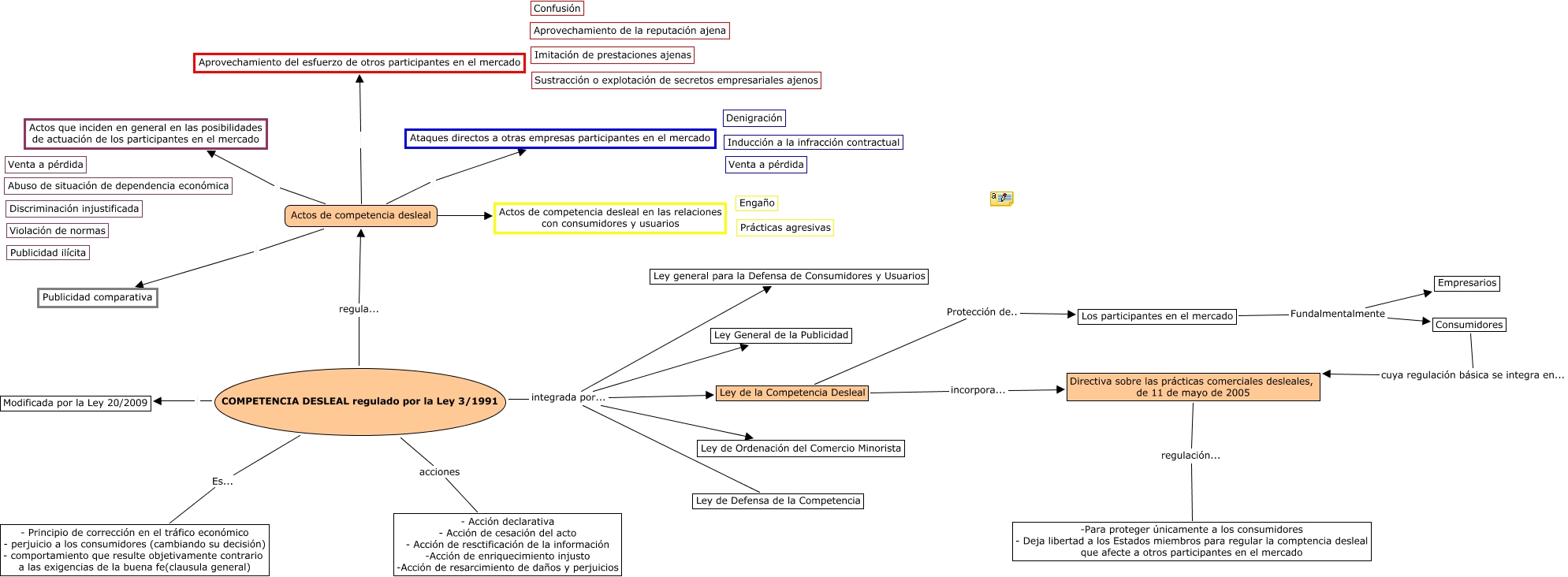 Este Cmap, tiene información relacionada con: Mapa conceptual Escenario 2, COMPETENCIA DESLEAL regulado por la Ley 3/1991 integrada por... Ley de la Competencia Desleal, COMPETENCIA DESLEAL regulado por la Ley 3/1991 integrada por... Ley general para la Defensa de Consumidores y Usuarios, Actos de competencia desleal Actos que inciden en general en las posibilidades de actuación de los participantes en el mercado, Consumidores cuya regulación básica se integra en... Directiva sobre las prácticas comerciales desleales, de 11 de mayo de 2005, Actos de competencia desleal Actos de competencia desleal en las relaciones con consumidores y usuarios, COMPETENCIA DESLEAL regulado por la Ley 3/1991 integrada por... Ley General de la Publicidad, COMPETENCIA DESLEAL regulado por la Ley 3/1991 Es... - Principio de corrección en el tráfico económico - perjuicio a los consumidores (cambiando su decisión) - comportamiento que resulte objetivamente contrario a las exigencias de la buena fe(clausula general), Actos de competencia desleal Ataques directos a otras empresas participantes en el mercado, Los participantes en el mercado Fundalmentalmente Consumidores, COMPETENCIA DESLEAL regulado por la Ley 3/1991 regula... Actos de competencia desleal, COMPETENCIA DESLEAL regulado por la Ley 3/1991 acciones - Acción declarativa - Acción de cesación del acto - Acción de resctificación de la información -Acción de enriquecimiento injusto -Acción de resarcimiento de daños y perjuicios, Actos de competencia desleal Publicidad comparativa, Ley de la Competencia Desleal incorpora... Directiva sobre las prácticas comerciales desleales, de 11 de mayo de 2005, COMPETENCIA DESLEAL regulado por la Ley 3/1991 integrada por... Ley de Defensa de la Competencia, Directiva sobre las prácticas comerciales desleales, de 11 de mayo de 2005 regulación... -Para proteger únicamente a los consumidores - Deja libertad a los Estados miembros para regular la comptencia desleal que afecte a otros participantes en el mercado, COMPETENCIA DESLEAL regulado por la Ley 3/1991 integrada por... Ley de Ordenación del Comercio Minorista, COMPETENCIA DESLEAL regulado por la Ley 3/1991 Modificada por la Ley 20/2009, Los participantes en el mercado Fundalmentalmente Empresarios, Ley de la Competencia Desleal Protección de.. Los participantes en el mercado, Actos de competencia desleal Aprovechamiento del esfuerzo de otros participantes en el mercado