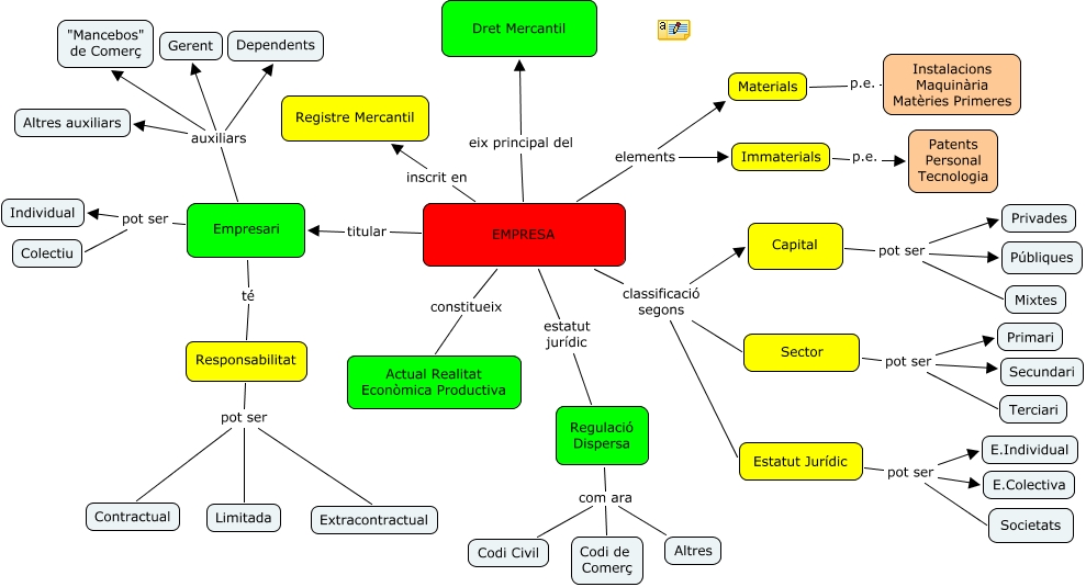 Este Cmap, tiene información relacionada con: Mapa conceptual 1 Empresa, Regulació Dispersa com ara Altres, EMPRESA classificació segons Estatut Jurídic, Empresari auxiliars Altres auxiliars, EMPRESA elements Immaterials, Empresari auxiliars Gerent, EMPRESA elements Materials, Responsabilitat pot ser Limitada, Sector pot ser Secundari, Empresari té Responsabilitat, Regulació Dispersa com ara Codi Civil, Empresari pot ser Colectiu, EMPRESA eix principal del Dret Mercantil, Responsabilitat pot ser Contractual, EMPRESA constitueix Actual Realitat Econòmica Productiva, Capital pot ser Públiques, Empresari pot ser Individual, Estatut Jurídic pot ser Societats, Sector pot ser Terciari, Responsabilitat pot ser Extracontractual, EMPRESA titular Empresari
