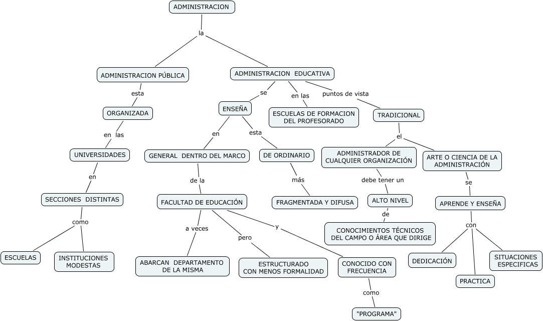 Este Cmap, tiene información relacionada con: ADMINISTRACION, SECCIONES DISTINTAS como INSTITUCIONES MODESTAS, FACULTAD DE EDUCACIÓN pero ESTRUCTURADO CON MENOS FORMALIDAD, APRENDE Y ENSEÑA con SITUACIONES ESPECIFICAS, TRADICIONAL el ADMINISTRADOR DE CUALQUIER ORGANIZACIÓN, ADMINISTRACION EDUCATIVA puntos de vista TRADICIONAL, ADMINISTRACION EDUCATIVA en las ESCUELAS DE FORMACION DEL PROFESORADO, APRENDE Y ENSEÑA con DEDICACIÓN, ADMINISTRACION la ADMINISTRACION PÚBLICA, DE ORDINARIO más FRAGMENTADA Y DIFUSA, GENERAL DENTRO DEL MARCO de la FACULTAD DE EDUCACIÓN, ADMINISTRACION la ADMINISTRACION EDUCATIVA, ADMINISTRACION EDUCATIVA se ENSEÑA, APRENDE Y ENSEÑA con PRACTICA, TRADICIONAL el ARTE O CIENCIA DE LA ADMINISTRACIÓN, ENSEÑA esta DE ORDINARIO, FACULTAD DE EDUCACIÓN y CONOCIDO CON FRECUENCIA, UNIVERSIDADES en SECCIONES DISTINTAS, ARTE O CIENCIA DE LA ADMINISTRACIÓN se APRENDE Y ENSEÑA, ALTO NIVEL de CONOCIMIENTOS TÉCNICOS DEL CAMPO O ÁREA QUE DIRIGE, ADMINISTRADOR DE CUALQUIER ORGANIZACIÓN debe tener un ALTO NIVEL