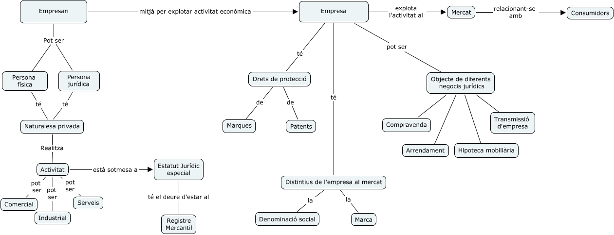 Este Cmap, tiene información relacionada con: Empresari i empresa, Naturalesa privada Realitza Activitat, Distintius de l'empresa al mercat la Marca, Persona física té Naturalesa privada, Objecte de diferents negocis jurídics ???? Transmissió d'empresa, Activitat pot ser Serveis, Activitat pot ser Industrial, Objecte de diferents negocis jurídics ???? Hipoteca mobiliària, Empresa pot ser Objecte de diferents negocis jurídics, Activitat pot ser Comercial, Activitat està sotmesa a Estatut Jurídic especial, Mercat relacionant-se amb Consumidors, Persona jurídica té Naturalesa privada, Empresari mitjà per explotar activitat econòmica Empresa, Distintius de l'empresa al mercat la Denominació social, Objecte de diferents negocis jurídics ???? Compravenda, Empresa té Drets de protecció, Drets de protecció de Patents, Objecte de diferents negocis jurídics ???? Arrendament, Empresari Pot ser Persona jurídica, Empresa té Distintius de l'empresa al mercat