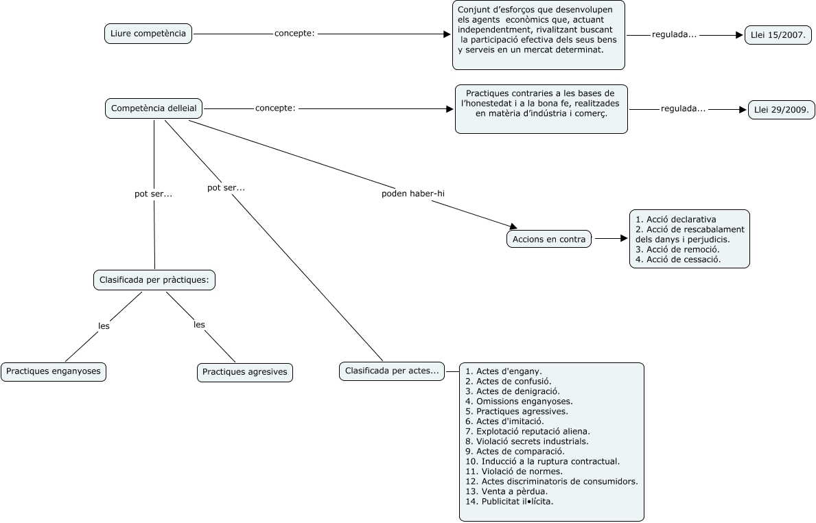 Este Cmap, tiene información relacionada con: Competencia deslleial, Practiques contraries a les bases de l’honestedat i a la bona fe, realitzades en matèria d’indústria i comerç. regulada... Llei 29/2009., Conjunt d’esforços que desenvolupen els agents econòmics que, actuant independentment, rivalitzant buscant la participació efectiva dels seus bens y serveis en un mercat determinat. regulada... Llei 15/2007., Competència delleial poden haber-hi Accions en contra, Liure competència concepte: Conjunt d’esforços que desenvolupen els agents econòmics que, actuant independentment, rivalitzant buscant la participació efectiva dels seus bens y serveis en un mercat determinat., Competència delleial pot ser... Clasificada per actes..., Competència delleial concepte: Practiques contraries a les bases de l’honestedat i a la bona fe, realitzades en matèria d’indústria i comerç., Accions en contra ???? 1. Acció declarativa 2. Acció de rescabalament dels danys i perjudicis. 3. Acció de remoció. 4. Acció de cessació., Clasificada per pràctiques: les Practiques agresives, Clasificada per pràctiques: les Practiques enganyoses, Clasificada per actes... 1. Actes d'engany. 2. Actes de confusió. 3. Actes de denigració. 4. Omissions enganyoses. 5. Practiques agressives. 6. Actes d'imitació. 7. Explotació reputació aliena. 8. Violació secrets industrials. 9. Actes de comparació. 10. Inducció a la ruptura contractual. 11. Violació de normes. 12. Actes discriminatoris de consumidors. 13. Venta a pèrdua. 14. Publicitat il•lícita., Competència delleial pot ser... Clasificada per pràctiques: