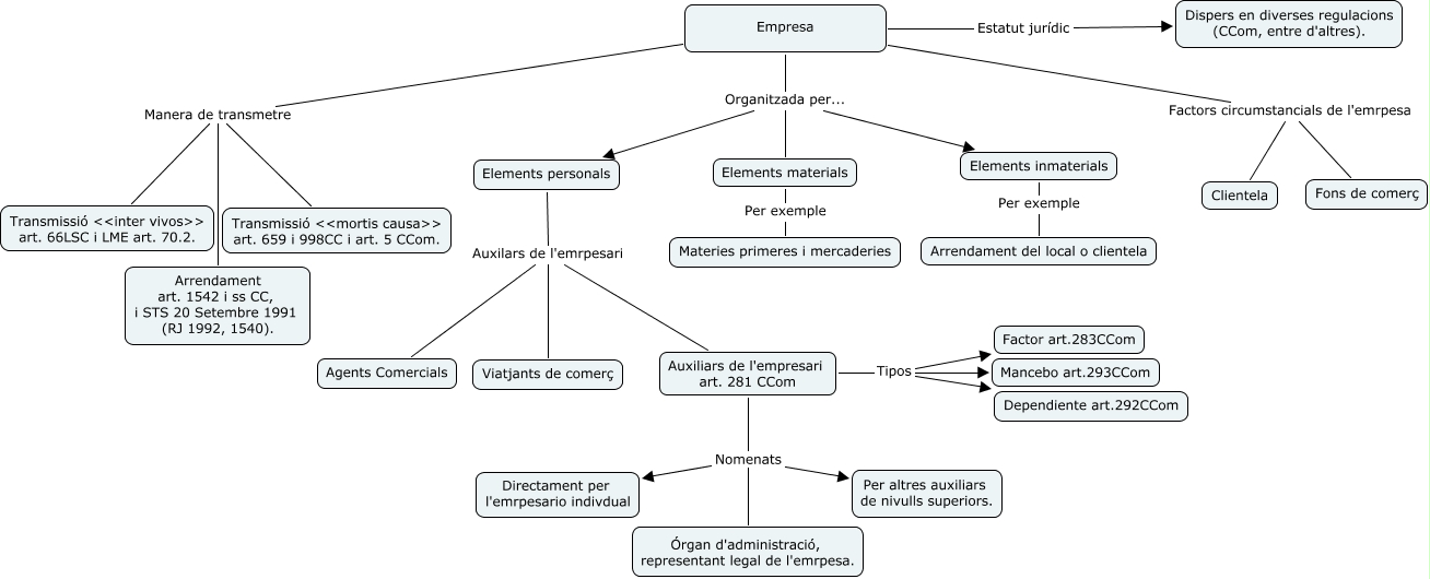 Aquest mapa conceptual conté informació relacionada amb: Empresa - Empresari, Elements materials Per exemple Materies primeres i mercaderies, Empresa Estatut jurídic Dispers en diverses regulacions (CCom, entre d'altres)., Empresa Factors circumstancials de l'emrpesa Fons de comerç, Empresa Manera de transmetre Transmissió <<inter vivos>> art. 66LSC i LME art. 70.2., Empresa Organitzada per... Elements personals, Elements inmaterials Per exemple Arrendament del local o clientela, Elements personals Auxilars de l'emrpesari Auxiliars de l'empresari art. 281 CCom, Auxiliars de l'empresari art. 281 CCom Tipos Mancebo art.293CCom, Elements personals Auxilars de l'emrpesari Agents Comercials, Empresa Manera de transmetre Transmissió <<mortis causa>> art. 659 i 998CC i art. 5 CCom., Auxiliars de l'empresari art. 281 CCom Nomenats Per altres auxiliars de nivulls superiors., Empresa Manera de transmetre Arrendament art. 1542 i ss CC, i STS 20 Setembre 1991 (RJ 1992, 1540)., Auxiliars de l'empresari art. 281 CCom Nomenats Órgan d'administració, representant legal de l'emrpesa., Empresa Organitzada per... Elements materials, Auxiliars de l'empresari art. 281 CCom Tipos Dependiente art.292CCom, Empresa Factors circumstancials de l'emrpesa Clientela, Auxiliars de l'empresari art. 281 CCom Nomenats Directament per l'emrpesario indivdual, Auxiliars de l'empresari art. 281 CCom Tipos Factor art.283CCom, Elements personals Auxilars de l'emrpesari Viatjants de comerç, Empresa Organitzada per... Elements inmaterials