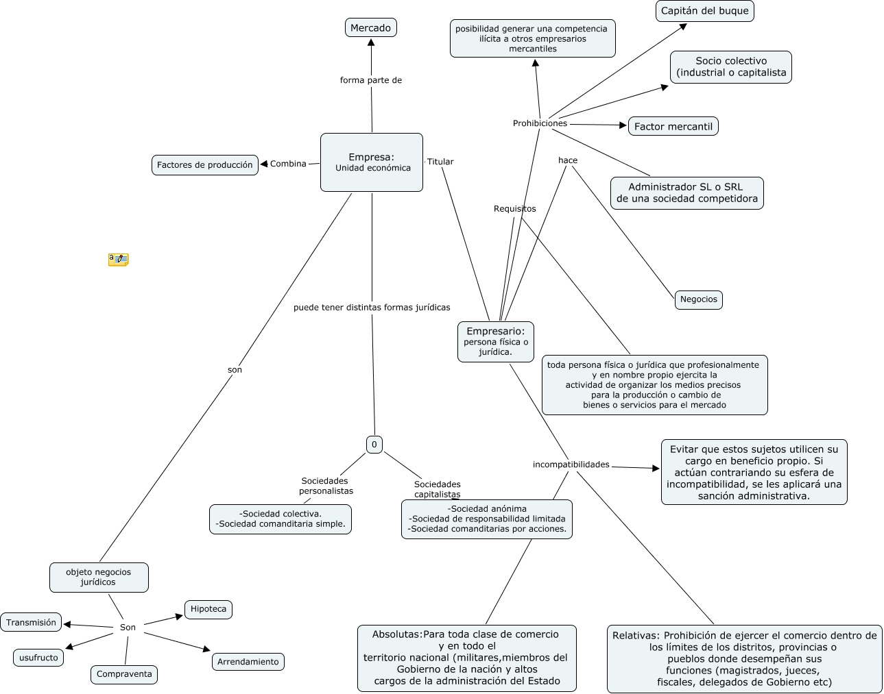Este Cmap, tiene información relacionada con: mapa 1, Empresario: persona física o jurídica. Prohibiciones Administrador SL o SRL de una sociedad competidora, Empresario: persona física o jurídica. incompatibilidades Relativas: Prohibición de ejercer el comercio dentro de los límites de los distritos, provincias o pueblos donde desempeñan sus funciones (magistrados, jueces, fiscales, delegados de Gobierno etc), 0 Sociedades capitalistas -Sociedad anónima -Sociedad de responsabilidad limitada -Sociedad comanditarias por acciones., Empresario: persona física o jurídica. Prohibiciones Capitán del buque, objeto negocios jurídicos Son usufructo, Empresario: persona física o jurídica. hace Negocios, Empresa: Unidad económica Titular Empresario: persona física o jurídica., objeto negocios jurídicos Son Arrendamiento, Empresa: Unidad económica Combina Factores de producción, Empresario: persona física o jurídica. Prohibiciones Factor mercantil, Empresario: persona física o jurídica. Requisitos toda persona física o jurídica que profesionalmente y en nombre propio ejercita la actividad de organizar los medios precisos para la producción o cambio de bienes o servicios para el mercado, 0 Sociedades personalistas -Sociedad colectiva. -Sociedad comanditaria simple., objeto negocios jurídicos Son Hipoteca, objeto negocios jurídicos Son Compraventa, Empresa: Unidad económica forma parte de Mercado, Empresario: persona física o jurídica. Prohibiciones Socio colectivo (industrial o capitalista, Empresario: persona física o jurídica. Prohibiciones posibilidad generar una competencia ilícita a otros empresarios mercantiles, objeto negocios jurídicos Son Transmisión, Empresa: Unidad económica puede tener distintas formas jurídicas 0, Empresario: persona física o jurídica. incompatibilidades Evitar que estos sujetos utilicen su cargo en beneficio propio. Si actúan contrariando su esfera de incompatibilidad, se les aplicará una sanción administrativa.