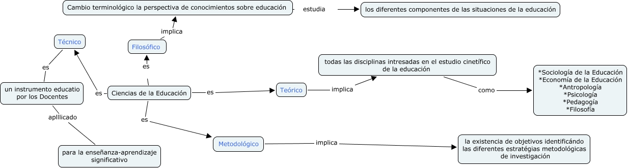 Este Cmap, tiene información relacionada con: Ciencias de la Educacón, Ciencias de la Educación es Teórico, Técnico es un instrumento educatio por los Docentes, todas las disciplinas intresadas en el estudio cinetífico de la educación como *Sociología de la Educación *Economía de la Educación *Antropología *Psicología *Pedagogía *Filosofía, Cambio terminológico la perspectiva de conocimientos sobre educación estudia los diferentes componentes de las situaciones de la educación, Metodológico implica la existencia de objetivos identificándo las diferentes estratégias metodológicas de investigación, Teórico implica todas las disciplinas intresadas en el estudio cinetífico de la educación, un instrumento educatio por los Docentes aplllicado para la enseñanza-aprendizaje significativo, Ciencias de la Educación es Técnico, Ciencias de la Educación es Metodológico, Ciencias de la Educación es Filosófico, Filosófico implica Cambio terminológico la perspectiva de conocimientos sobre educación