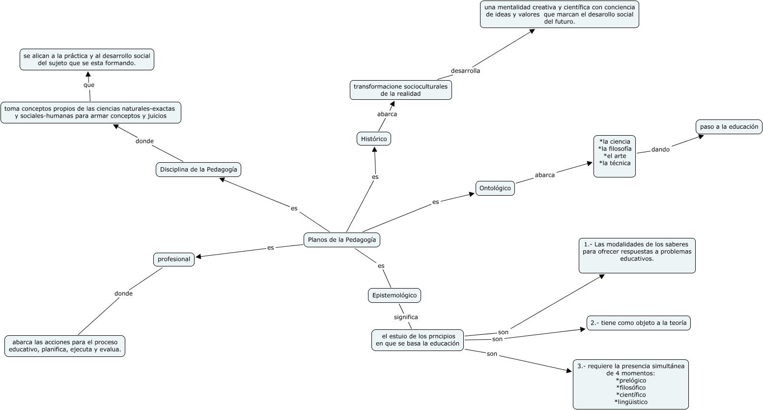 Este Cmap, tiene información relacionada con: Planos de la Eduación, profesional donde abarca las acciones para el proceso educativo, planifica, ejecuta y evalua., Ontológico abarca *la ciencia *la filosofía *el arte *la técnica, toma conceptos propios de las ciencias naturales-exactas y sociales-humanas para armar conceptos y juicios que se alican a la práctica y al desarrollo social del sujeto que se esta formando., Planos de la Pedagogía es profesional, Histórico abarca transformacione socioculturales de la realidad, Disciplina de la Pedagogía donde toma conceptos propios de las ciencias naturales-exactas y sociales-humanas para armar conceptos y juicios, el estuio de los prncipios en que se basa la educación son 1.- Las modalidades de los saberes para ofrecer respuestas a problemas educativos., Epistemológico significa el estuio de los prncipios en que se basa la educación, *la ciencia *la filosofía *el arte *la técnica dando paso a la educación, Planos de la Pedagogía es Epistemológico, el estuio de los prncipios en que se basa la educación son 3.- requiere la presencia simultánea de 4 momentos: *prelógico *filosófico *científico *lingüistico, el estuio de los prncipios en que se basa la educación son 2.- tiene como objeto a la teoría, transformacione socioculturales de la realidad desarrolla una mentalidad creativa y científica con conciencia de ideas y valores que marcan el desarollo social del futuro., Planos de la Pedagogía es Ontológico, Planos de la Pedagogía es Disciplina de la Pedagogía, Planos de la Pedagogía es Histórico