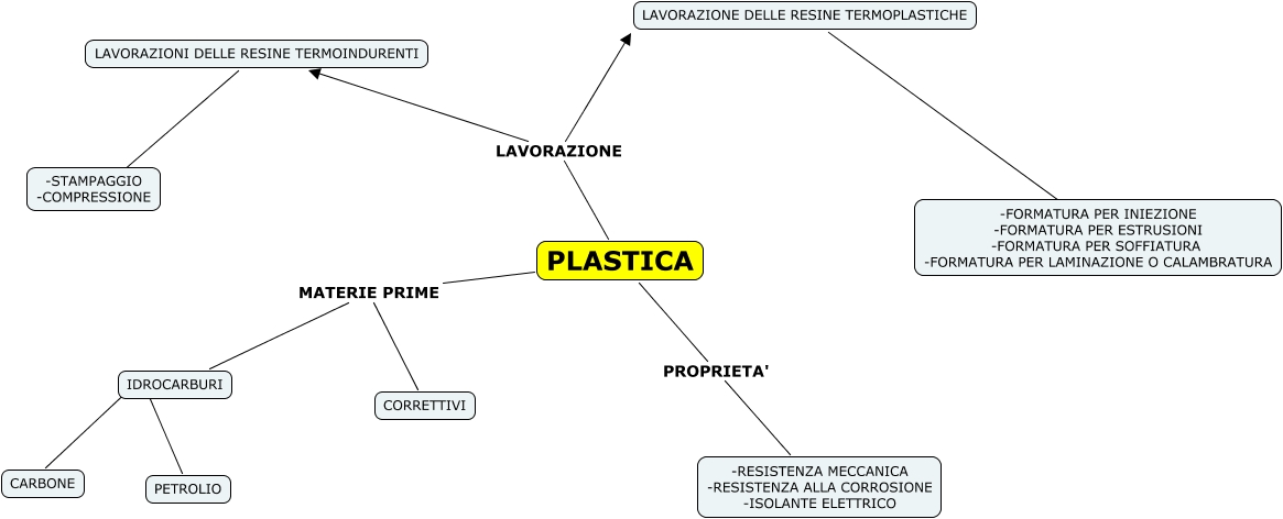 Questa Cmap, creata con IHMC CmapTools, contiene informazioni relative a: PLASTICA, PLASTICA PROPRIETA' -RESISTENZA MECCANICA -RESISTENZA ALLA CORROSIONE -ISOLANTE ELETTRICO, PLASTICA MATERIE PRIME CORRETTIVI, PLASTICA LAVORAZIONE LAVORAZIONE DELLE RESINE TERMOPLASTICHE, IDROCARBURI ???? CARBONE, LAVORAZIONI DELLE RESINE TERMOINDURENTI ???? -STAMPAGGIO -COMPRESSIONE, PLASTICA LAVORAZIONE LAVORAZIONI DELLE RESINE TERMOINDURENTI, LAVORAZIONE DELLE RESINE TERMOPLASTICHE ???? -FORMATURA PER INIEZIONE -FORMATURA PER ESTRUSIONI -FORMATURA PER SOFFIATURA -FORMATURA PER LAMINAZIONE O CALAMBRATURA, PLASTICA MATERIE PRIME IDROCARBURI, IDROCARBURI ???? PETROLIO