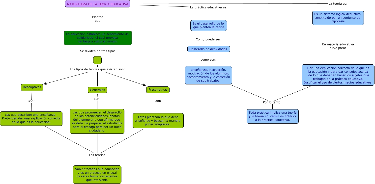 Este Cmap, tiene información relacionada con: Naturaleza de la teoría educativa, Los tipos de teorías que existen son: Descriptivas, NATURALEZA DE LA TEORÍA EDUCATIVA La teoría es: Es un sistema lógico-deductivo constituido por un conjunto de hipótesis, Las que promueven el desarrollo de las potencialidades innatas del alumno a lo que afirma que se debe de preparar al estudiante para el trabajo para ser un buen ciudadano. Las teorías Van enfocadas a la educación y es un proceso en el cual los seres humanos tenemos que intervenir., enseñanza, instrucción, motivación de los alumnos, asesoramiento y la correción de sus trabajos. Por lo tanto: Toda práctica implica una teoría y la teoría educativa es anterior a la práctica educativa., Generales son: Las que promueven el desarrollo de las potencialidades innatas del alumno a lo que afirma que se debe de preparar al estudiante para el trabajo para ser un buen ciudadano., NATURALEZA DE LA TEORÍA EDUCATIVA La práctica educativa es: Es el desarrollo de lo que plantea la teoría, Las que describen una enseñanza. Pretenden dar una explicación correcta de lo que es la educación. Las teorías Van enfocadas a la educación y es un proceso en el cual los seres humanos tenemos que intervenir., Desarrollo de actividades como son: enseñanza, instrucción, motivación de los alumnos, asesoramiento y la correción de sus trabajos., Es el desarrollo de lo que plantea la teoría Como puede ser: Desarrollo de actividades, Prescriptivas son: Éstas plantean lo que debe enseñarse y buscan la manera poder adaptarse., Éstas plantean lo que debe enseñarse y buscan la manera poder adaptarse. Van enfocadas a la educación y es un proceso en el cual los seres humanos tenemos que intervenir., Los tipos de teorías que existen son: Prescriptivas, Descriptivas son: Las que describen una enseñanza. Pretenden dar una explicación correcta de lo que es la educación., Los tipos de teorías que existen son: Generales, Dar una explicación correcta de lo que es la educación y para dar consejos acerca de lo que deberían hacer los sujetos que trabajan en la práctica educativa. Justificar el uso de ciertos medios educativos. Toda práctica implica una teoría y la teoría educativa es anterior a la práctica educativa., NATURALEZA DE LA TEORÍA EDUCATIVA Plantea que: La educación establece un sentimiento de solidaridad, el cual provoca un bagaje cultural común., Es un sistema lógico-deductivo constituido por un conjunto de hipótesis En materia educativa sirve para: Dar una explicación correcta de lo que es la educación y para dar consejos acerca de lo que deberían hacer los sujetos que trabajan en la práctica educativa. Justificar el uso de ciertos medios educativos., La educación establece un sentimiento de solidaridad, el cual provoca un bagaje cultural común. Se dividen en tres tipos