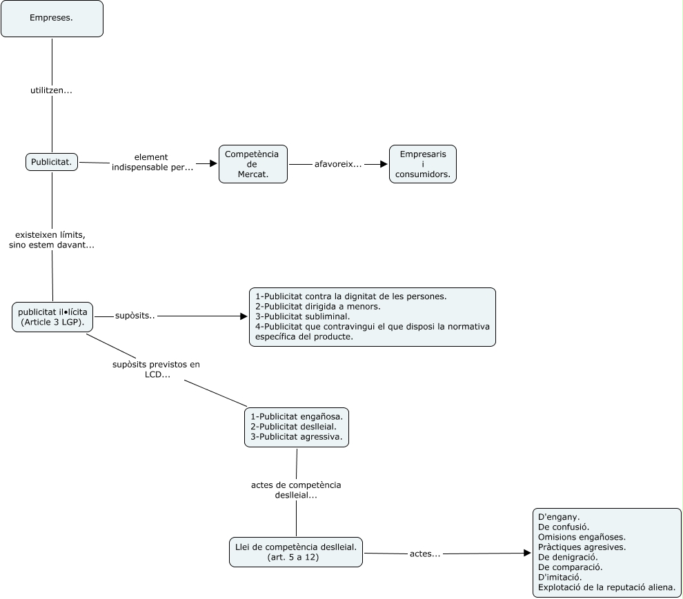 Este Cmap, tiene información relacionada con: Escenari 3, Empreses. utilitzen... Publicitat., publicitat il•lícita (Article 3 LGP). supòsits previstos en LCD... 1-Publicitat engañosa. 2-Publicitat deslleial. 3-Publicitat agressiva., 1-Publicitat engañosa. 2-Publicitat deslleial. 3-Publicitat agressiva. actes de competència deslleial... Llei de competència deslleial. (art. 5 a 12), Llei de competència deslleial. (art. 5 a 12) actes... D'engany. De confusió. Omisions engañoses. Pràctiques agresives. De denigració. De comparació. D'imitació. Explotació de la reputació aliena., Competència de Mercat. afavoreix... Empresaris i consumidors., Publicitat. existeixen límits, sino estem davant... publicitat il•lícita (Article 3 LGP)., publicitat il•lícita (Article 3 LGP). supòsits.. 1-Publicitat contra la dignitat de les persones. 2-Publicitat dirigida a menors. 3-Publicitat subliminal. 4-Publicitat que contravingui el que disposi la normativa específica del producte., Publicitat. element indispensable per... Competència de Mercat.
