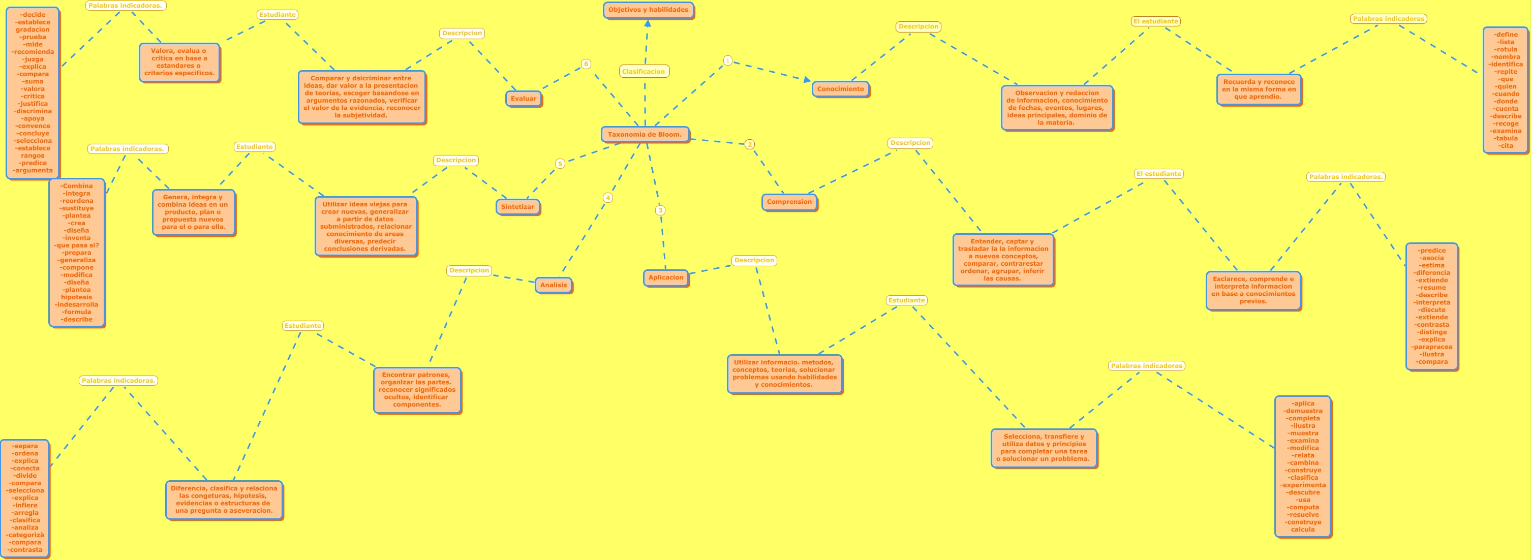 Este Cmap, tiene información relacionada con: Taxonomìa de bloom, Taxonomìa de Bloom. 6 Evaluar, Utilizar informacio. metodos, conceptos, teorias, solucionar problemas usando habilidades y conocimientos. Estudiante Selecciona, transfiere y utiliza datos y principios para completar una tarea o solucionar un probblema., Taxonomìa de Bloom. Clasificacion Objetivos y habilidades, Taxonomìa de Bloom. 1 Conocimiento, Genera, integra y combina ideas en un producto, plan o propuesta nuevos para el o para ella. Palabras indicadoras. -Combina -integra -reordena -sustituye -plantea -crea -diseña -inventa -que pasa si? -prepara -generaliza -compone -modifica -diseña -plantea hipotesis -indesarrolla -formula -describe, Esclarece, comprende e interpreta informacion en base a conocimientos previos. Palabras indicadoras. -predice -asocia -estima -diferencia -extiende -resume -describe -interpreta -discute -extiende -contrasta -distinge -explica -parapracea -ilustra -compara, Taxonomìa de Bloom. 4 Analisis, Observacion y redaccion de informacion, conocimiento de fechas, eventos, lugares, ideas principales, dominio de la materia. El estudiante Recuerda y reconoce en la misma forma en que aprendio., Selecciona, transfiere y utiliza datos y principios para completar una tarea o solucionar un probblema. Palabras indicadoras -aplica -demuestra -completa -ilustra -muestra -examina -modifica -relata -cambina -construye -clasifica -experimenta -descubre -usa -computa -resuelve -construye calcula, Aplicacion Descripcion Utilizar informacio. metodos, conceptos, teorias, solucionar problemas usando habilidades y conocimientos., Diferencia, clasifica y relaciona las congeturas, hipotesis, evidencias o estructuras de una pregunta o aseveracion. Palabras indicadoras. -separa -ordena -explica -conecta -divide -compara -selecciona -explica -infiere -arregla -clasifica -analiza -categorizà -compara -contrasta, Analisis Descripcion Encontrar patrones, organlzar las partes. reconocer significados ocultos, identificar componentes., Comprension Descripcion Entender, captar y trasladar la la informacion a nuevos conceptos, comparar, contrarestar ordenar, agrupar, inferir las causas., Comparar y dsicriminar entre ideas, dar valor a la presentacion de teorias, escoger basandose en argumentos razonados, verificar el valor de la evidencia, reconocer la subjetividad. Estudiante Valora, evalua o critica en base a estandares o criterios especificos., Entender, captar y trasladar la la informacion a nuevos conceptos, comparar, contrarestar ordenar, agrupar, inferir las causas. El estudiante Esclarece, comprende e interpreta informacion en base a conocimientos previos., Recuerda y reconoce en la misma forma en que aprendio. Palabras indicadoras -define -lista -rotula -nombra -identifica -repite -que -quien -cuando -donde -cuenta -describe -recoge -examina -tabula -cita, Conocimiento Descripcion Observacion y redaccion de informacion, conocimiento de fechas, eventos, lugares, ideas principales, dominio de la materia., Taxonomìa de Bloom. 3 Aplicacion, Encontrar patrones, organlzar las partes. reconocer significados ocultos, identificar componentes. Estudiante Diferencia, clasifica y relaciona las congeturas, hipotesis, evidencias o estructuras de una pregunta o aseveracion., Taxonomìa de Bloom. 5 Sintetizar