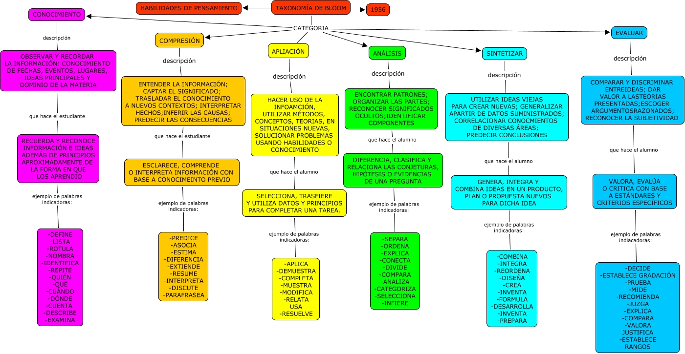 Este Cmap, tiene información relacionada con: TAXONOMIA DE BLOOM, ANÁLISIS descripción ENCONTRAR PATRONES; ORGANIZAR LAS PARTES; RECONOCER SIGNIFICADOS OCULTOS;IDENTIFICAR COMPONENTES, TAXONOMÍA DE BLOOM CATEGORIA SINTETIZAR, TAXONOMÍA DE BLOOM CATEGORIA ANÁLISIS, DIFERENCIA, CLASIFICA Y RELACIONA LAS CONJETURAS, HIPÓTESIS O EVIDENCIAS DE UNA PREGUNTA ejemplo de palabras indicadoras: -SEPARA -ORDENA -EXPLICA -CONECTA -DIVIDE -COMPARA -ANALIZA -CATEGORIZA -SELECCIONA -INFIERE, TAXONOMÍA DE BLOOM CATEGORIA APLIACIÓN, COMPRESIÓN descripción ENTENDER LA INFORMACIÓN; CAPTAR EL SIGNIFICADO; TRASLADAR EL CONOCIMIENTO A NUEVOS CONTEXTOS; INTERPRETAR HECHOS;INFERIR LAS CAUSAS; PREDECIR LAS CONSECUENCIAS, SINTETIZAR descripción UTILIZAR IDEAS VIEJAS PARA CREAR NUEVAS; GENERALIZAR APARTIR DE DATOS SUMINISTRADOS; CORRELACIONAR CONOCMIENTOS DE DIVERSAS ÁREAS; PREDECIR CONCLUSIONES, GENERA, INTEGRA Y COMBINA IDEAS EN UN PRODUCTO, PLAN O PROPUESTA NUEVOS PARA DICHA IDEA ejemplo de palabras indicadoras: -COMBINA -INTEGRA -REORDENA -DISEÑA -CREA -INVENTA -FORMULA -DESARROLLA -INVENTA -PREPARA, ENTENDER LA INFORMACIÓN; CAPTAR EL SIGNIFICADO; TRASLADAR EL CONOCIMIENTO A NUEVOS CONTEXTOS; INTERPRETAR HECHOS;INFERIR LAS CAUSAS; PREDECIR LAS CONSECUENCIAS que hace el estudiante ESCLARECE, COMPRENDE O INTERPRETA INFORMACIÓN CON BASE A CONOCIMEINTO PREVIO, COMPARAR Y DISCRIMINAR ENTREIDEAS; DAR VALOR A LASTEORIAS PRESENTADAS;ESCOGER ARGUMENTOSRAZONADOS; RECONOCER LA SUBJETIVIDAD que hace el alumno VALORA, EVALÚA O CRITICA CON BASE A ESTÁNDARES Y CRITERIOS ESPECÍFICOS, TAXONOMÍA DE BLOOM CATEGORIA CONOCIMIENTO, UTILIZAR IDEAS VIEJAS PARA CREAR NUEVAS; GENERALIZAR APARTIR DE DATOS SUMINISTRADOS; CORRELACIONAR CONOCMIENTOS DE DIVERSAS ÁREAS; PREDECIR CONCLUSIONES que hace el alumno GENERA, INTEGRA Y COMBINA IDEAS EN UN PRODUCTO, PLAN O PROPUESTA NUEVOS PARA DICHA IDEA, TAXONOMÍA DE BLOOM CATEGORIA EVALUAR, SELECCIONA, TRASFIERE Y UTILIZA DATOS Y PRINCIPIOS PARA COMPLETAR UNA TAREA. ejemplo de palabras indicadoras: -APLICA -DEMUESTRA -COMPLETA -MUESTRA -MODIFICA -RELATA USA -RESUELVE, CONOCIMIENTO descripción OBSERVAR Y RECORDAR LA INFORMACIÓN: CONOCIMIENTO DE FECHAS, EVENTOS, LUGARES, IDEAS PRINCIPALES Y DOMINIO DE LA MATERIA, TAXONOMÍA DE BLOOM ???? HABILIDADES DE PENSAMIENTO, OBSERVAR Y RECORDAR LA INFORMACIÓN: CONOCIMIENTO DE FECHAS, EVENTOS, LUGARES, IDEAS PRINCIPALES Y DOMINIO DE LA MATERIA que hace el estudiante RECUERDA Y RECONOCE INFORMACIÓN E IDEAS ADEMÁS DE PRINCIPIOS APROXIMADAMENTE DE LA FORMA EN QUE LOS APRENDIO, TAXONOMÍA DE BLOOM CATEGORIA COMPRESIÓN, EVALUAR descripción COMPARAR Y DISCRIMINAR ENTREIDEAS; DAR VALOR A LASTEORIAS PRESENTADAS;ESCOGER ARGUMENTOSRAZONADOS; RECONOCER LA SUBJETIVIDAD, TAXONOMÍA DE BLOOM ???? 1956
