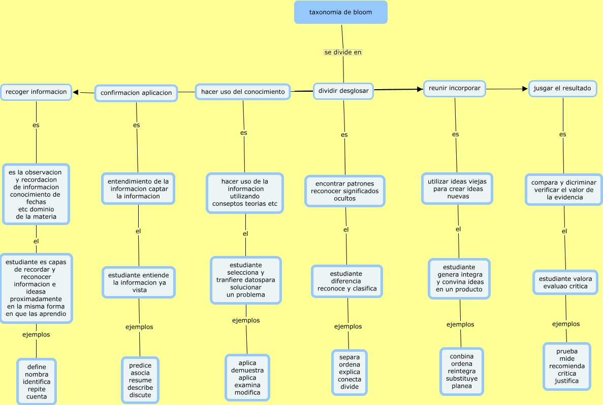 Este Cmap, tiene información relacionada con: taxonomia de bloom, confirmacion aplicacion recoger informacion, estudiante diferencia reconoce y clasifica ejemplos separa ordena explica conecta divide, reunir incorporar es utilizar ideas viejas para crear ideas nuevas, hacer uso del conocimiento es hacer uso de la informacion utilizando conseptos teorias etc, entendimiento de la informacion captar la informacion el estudiante entiende la informacion ya vista, dividir desglosar es encontrar patrones reconocer significados ocultos, es la observacion y recordacion de informacion conocimiento de fechas etc dominio de la materia el estudiante es capas de recordar y reconocer informacion e ideasa proximadamente en la misma forma en que las aprendio, estudiante genera integra y convina ideas en un producto ejemplos conbina ordena reintegra substituye planea, confirmacion aplicacion es entendimiento de la informacion captar la informacion, estudiante es capas de recordar y reconocer informacion e ideasa proximadamente en la misma forma en que las aprendio ejemplos define nombra identifica repite cuenta, hacer uso de la informacion utilizando conseptos teorias etc el estudiante selecciona y tranfiere datospara solucionar un problema, estudiante valora evaluao critica ejemplos prueba mide recomienda critica justifica, compara y dicriminar verificar el valor de la evidencia el estudiante valora evaluao critica, utilizar ideas viejas para crear ideas nuevas el estudiante genera integra y convina ideas en un producto, dividir desglosar hacer uso del conocimiento, dividir desglosar reunir incorporar, taxonomia de bloom se divide en dividir desglosar, encontrar patrones reconocer significados ocultos el estudiante diferencia reconoce y clasifica, estudiante entiende la informacion ya vista ejemplos predice asocia resume describe discute, jusgar el resultado es compara y dicriminar verificar el valor de la evidencia