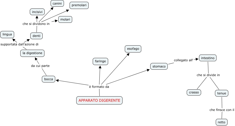 Questa Cmap, creata con IHMC CmapTools, contiene informazioni relative a: apparato digerente, denti che si dividono in premolari, APPARATO DIGERENTE è formato da bocca, la digestione supportata dall'azione di lingua, denti che si dividono in molari, APPARATO DIGERENTE è formato da esofago, bocca da cui parte la digestione, denti che si dividono in canini, tenue che finsce con il retto, la digestione supportata dall'azione di denti, APPARATO DIGERENTE è formato da faringe, denti che si dividono in incisivi, APPARATO DIGERENTE è formato da stomaco, intestino che si divide in tenue, intestino che si divide in crasso, stomaco collegato all' intestino