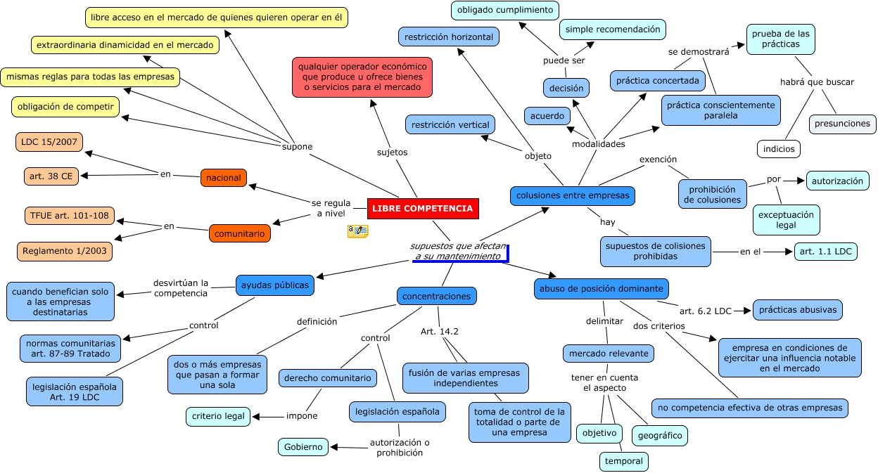 Este Cmap, tiene información relacionada con: Libre Competencia, LIBRE COMPETENCIA sujetos qualquier operador económico que produce u ofrece bienes o servicios para el mercado, LIBRE COMPETENCIA supuestos que afectan a su mantenimiento ayudas públicas, colusiones entre empresas objeto restricción vertical, colusiones entre empresas hay supuestos de colisiones prohibidas, prohibición de colusiones por exceptuación legal, decisión puede ser obligado cumplimiento, colusiones entre empresas modalidades práctica concertada, concentraciones control derecho comunitario, decisión puede ser simple recomendación, prueba de las prácticas habrá que buscar presunciones, prohibición de colusiones por autorización, colusiones entre empresas modalidades decisión, ayudas públicas desvirtúan la competencia cuando benefician solo a las empresas destinatarias, LIBRE COMPETENCIA supone extraordinaria dinamicidad en el mercado, colusiones entre empresas modalidades acuerdo, concentraciones Art. 14.2 fusión de varias empresas independientes, LIBRE COMPETENCIA supuestos que afectan a su mantenimiento abuso de posición dominante, comunitario en Reglamento 1/2003, abuso de posición dominante art. 6.2 LDC prácticas abusivas, abuso de posición dominante dos criterios empresa en condiciones de ejercitar una influencia notable en el mercado