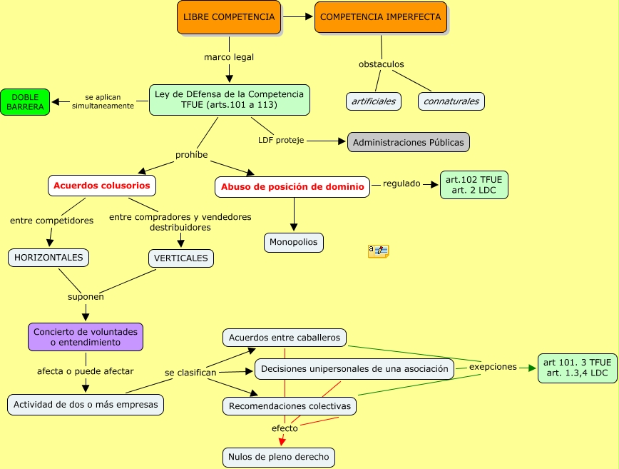 Este Cmap, tiene información relacionada con: 3 Libre competencia, Ley de DEfensa de la Competencia TFUE (arts.101 a 113) LDF proteje Administraciones Públicas, Ley de DEfensa de la Competencia TFUE (arts.101 a 113) prohíbe Acuerdos colusorios, LIBRE COMPETENCIA marco legal Ley de DEfensa de la Competencia TFUE (arts.101 a 113), Concierto de voluntades o entendimiento afecta o puede afectar Actividad de dos o más empresas, Ley de DEfensa de la Competencia TFUE (arts.101 a 113) prohíbe Abuso de posición de dominio, Decisiones unipersonales de una asociación exepciones art 101. 3 TFUE art. 1.3,4 LDC, Actividad de dos o más empresas se clasifican Acuerdos entre caballeros, HORIZONTALES suponen Concierto de voluntades o entendimiento, Actividad de dos o más empresas se clasifican Decisiones unipersonales de una asociación, HORIZONTALES suponen VERTICALES, Acuerdos entre caballeros efecto Nulos de pleno derecho, LIBRE COMPETENCIA ???? COMPETENCIA IMPERFECTA, COMPETENCIA IMPERFECTA obstaculos artificiales, Abuso de posición de dominio ???? Monopolios, Acuerdos entre caballeros efecto Decisiones unipersonales de una asociación, COMPETENCIA IMPERFECTA obstaculos connaturales, Ley de DEfensa de la Competencia TFUE (arts.101 a 113) se aplican simultaneamente DOBLE BARRERA, Abuso de posición de dominio regulado art.102 TFUE art. 2 LDC, Acuerdos colusorios entre competidores HORIZONTALES, Acuerdos entre caballeros exepciones art 101. 3 TFUE art. 1.3,4 LDC
