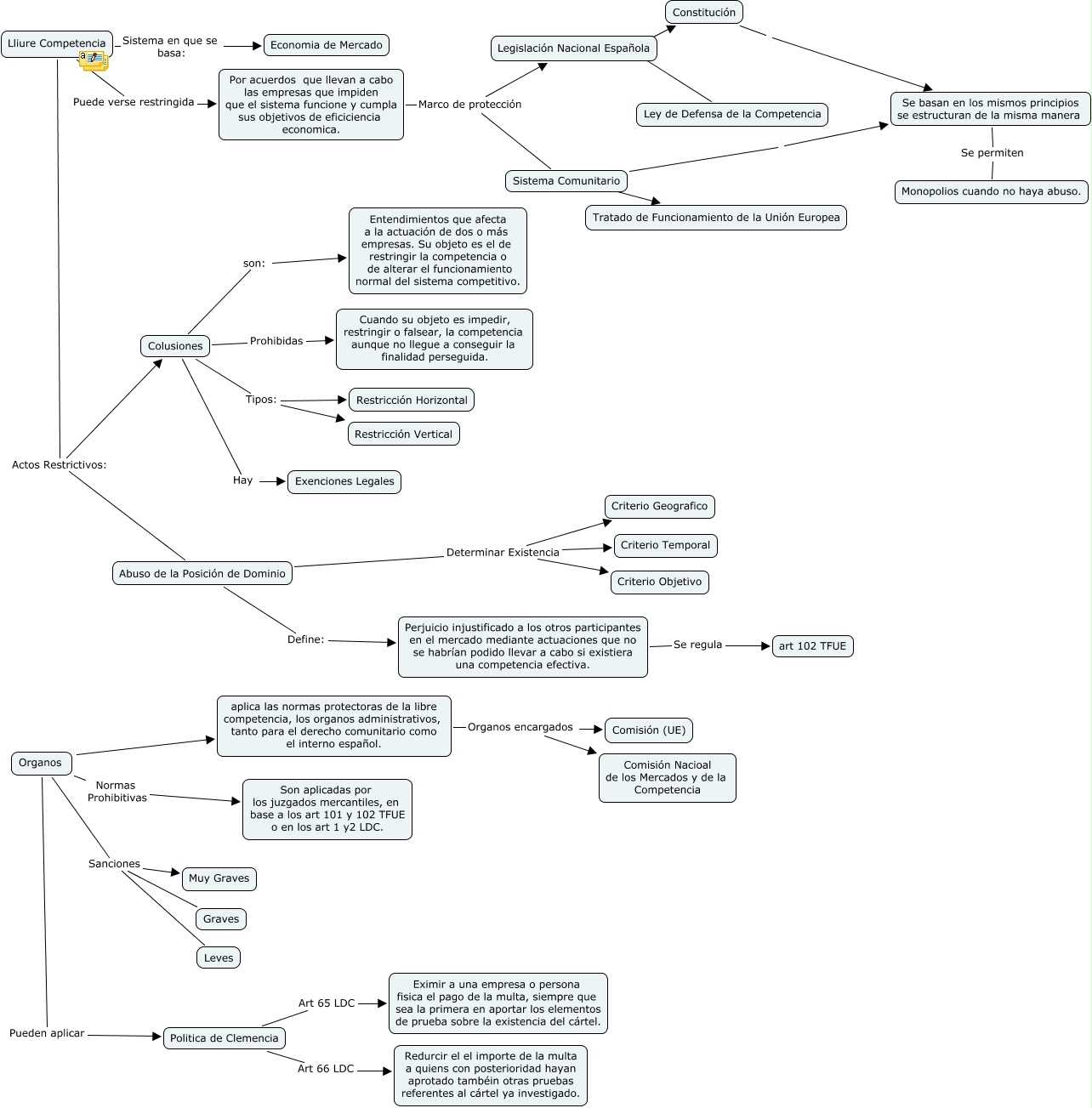 Este Cmap, tiene información relacionada con: Cas 4, Legislación Nacional Española ???? Constitución, Perjuicio injustificado a los otros participantes en el mercado mediante actuaciones que no se habrían podido llevar a cabo si existiera una competencia efectiva. Se regula art 102 TFUE, Organos aplica las normas protectoras de la libre competencia, los organos administrativos, tanto para el derecho comunitario como el interno español., Organos Sanciones Muy Graves, Abuso de la Posición de Dominio Define: Perjuicio injustificado a los otros participantes en el mercado mediante actuaciones que no se habrían podido llevar a cabo si existiera una competencia efectiva., Abuso de la Posición de Dominio Determinar Existencia Criterio Objetivo, Lliure Competencia Sistema en que se basa: Economia de Mercado, Colusiones Tipos: Restricción Horizontal, Politica de Clemencia Art 65 LDC Eximir a una empresa o persona fisica el pago de la multa, siempre que sea la primera en aportar los elementos de prueba sobre la existencia del cártel., Lliure Competencia Actos Restrictivos: Abuso de la Posición de Dominio, Organos Sanciones Leves, Por acuerdos que llevan a cabo las empresas que impiden que el sistema funcione y cumpla sus objetivos de eficiciencia economica. Marco de protección Sistema Comunitario, Sistema Comunitario ???? Tratado de Funcionamiento de la Unión Europea, Colusiones Hay Exenciones Legales, Lliure Competencia Actos Restrictivos: Colusiones, Colusiones Prohibidas Cuando su objeto es impedir, restringir o falsear, la competencia aunque no llegue a conseguir la finalidad perseguida., Por acuerdos que llevan a cabo las empresas que impiden que el sistema funcione y cumpla sus objetivos de eficiciencia economica. Marco de protección Legislación Nacional Española, Lliure Competencia Puede verse restringida Por acuerdos que llevan a cabo las empresas que impiden que el sistema funcione y cumpla sus objetivos de eficiciencia economica., Organos Pueden aplicar Politica de Clemencia, Organos Sanciones Graves