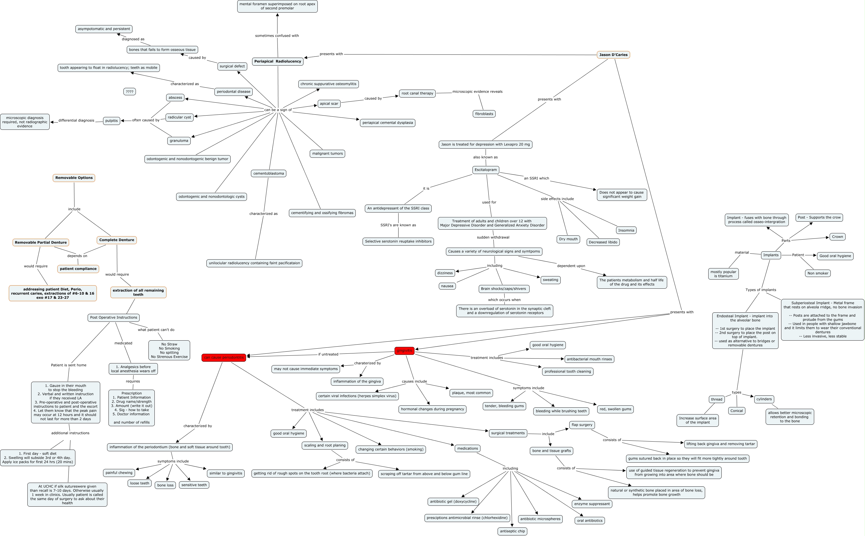This Concept Map, created with IHMC CmapTools, has information related to: Jason D'Caries, gingivitis charaterized by inflammation of the gingiva, Periapical Radiolucency can be a sign of odontogenic and nonodontogenic benign tumor, Causes a variety of neurological signs and symtpoms including Brain shocks/zaps/shivers, flap surgery consists of lifting back gingiva and removing tartar, Jason D'Caries presents with gingivitis, inflammation of the periodontium (bone and soft tissue around tooth) symptoms include painful chewing, surgical defect caused by bones that fails to form osseous tissue, Complete Denture depends on patient compliance, Periapical Radiolucency can be a sign of periapical cemental dysplasia, Removable Options include Complete Denture, inflammation of the periodontium (bone and soft tissue around tooth) symptoms include similar to gingivitis, Escitalopram it is An antidepressant of the SSRI class, Endosteal Implant - implant into the alveolar bone -- 1st surgery to place the implant -- 2nd surgery to place the post on top of implant. -- used as alternative to bridges or removable dentures types cylinders, Implants Parts Implant - fuses with bone through process called osseo-intergration, Jason is treated for depression with Lexapro 20 mg also known as Escitalopram, Brain shocks/zaps/shivers which occurs when There is an overload of serotonin in the synaptic cleft and a downregulation of serotonin receptors, pulpitis differential diagnosis microscopic diagnosis required, not radiographic evidence, An antidepressant of the SSRI class SSRI's are known as Selective serotonin reuptake inhibitors, Implants Parts Crown, Periapical Radiolucency can be a sign of apical scar
