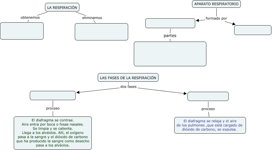 Este Cmap, tiene información relacionada con: LA RESPIRACIÓN MUDO, LAS FASES DE LA RESPIRACIÓN dos fases, LAS FASES DE LA RESPIRACIÓN dos fases, APARATO RESPIRATORIO formado por, LA RESPIRACIÓN eliminamos, APARATO RESPIRATORIO formado por, partes, proceso El diafragma se contrae. Aire entra por boca o fosas nasales. Se limpia y se calienta. Llega a los alvéolos. Allí, el oxígeno pasa a la sangre y el dióxido de carbono que ha producido la sangre como desecho pasa a los alvéolos., LA RESPIRACIÓN obtenemos, proceso El diafragma se relaja y el aire de los pulmones ,que está cargado de dióxido de carbono, se expulsa.
