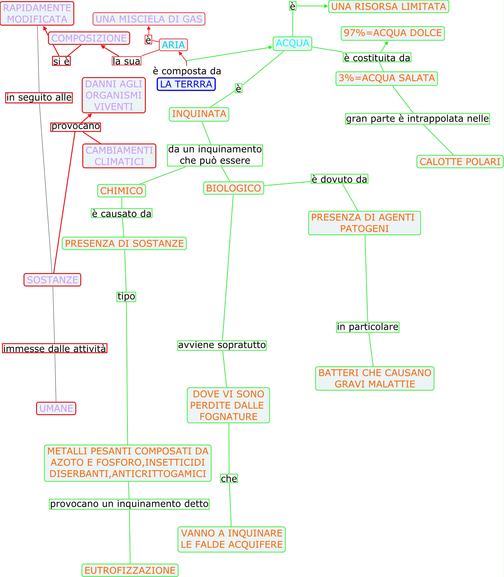 Questa Cmap, creata con IHMC CmapTools, contiene informazioni relative a: ACQUA E ARIA, RAPIDAMENTE MODIFICATA in seguito alle SOSTANZE, METALLI PESANTI COMPOSATI DA AZOTO E FOSFORO,INSETTICIDI DISERBANTI,ANTICRITTOGAMICI provocano un inquinamento detto EUTROFIZZAZIONE, SOSTANZE provocano CAMBIAMENTI CLIMATICI, ACQUA è costituita da 3%=ACQUA SALATA, SOSTANZE provocano DANNI AGLI ORGANISMI VIVENTI, ACQUA è costituita da 97%=ACQUA DOLCE, INQUINATA da un inquinamento che può essere CHIMICO, ACQUA è UNA RISORSA LIMITATA, INQUINATA da un inquinamento che può essere BIOLOGICO, LA TERRRA è composta da ACQUA, PRESENZA DI AGENTI PATOGENI in particolare BATTERI CHE CAUSANO GRAVI MALATTIE, 3%=ACQUA SALATA gran parte è intrappolata nelle CALOTTE POLARI, ACQUA è INQUINATA, BIOLOGICO avviene sopratutto DOVE VI SONO PERDITE DALLE FOGNATURE, DOVE VI SONO PERDITE DALLE FOGNATURE che VANNO A INQUINARE LE FALDE ACQUIFERE, ARIA la sua COMPOSIZIONE, SOSTANZE immesse dalle attività UMANE, LA TERRRA è composta da ARIA, ARIA è UNA MISCIELA DI GAS, BIOLOGICO è dovuto da PRESENZA DI AGENTI PATOGENI