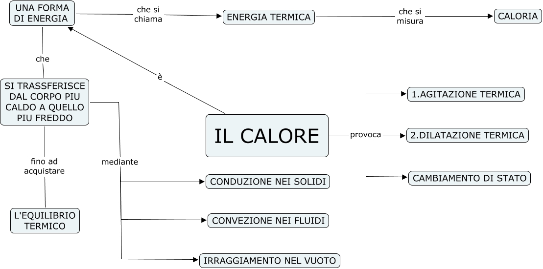 Questa Cmap, creata con IHMC CmapTools, contiene informazioni relative a: IL CALORE, IL CALORE è UNA FORMA DI ENERGIA, IL CALORE provoca CAMBIAMENTO DI STATO, IL CALORE provoca 2.DILATAZIONE TERMICA, SI TRASSFERISCE DAL CORPO PIU CALDO A QUELLO PIU FREDDO mediante IRRAGGIAMENTO NEL VUOTO, SI TRASSFERISCE DAL CORPO PIU CALDO A QUELLO PIU FREDDO mediante CONDUZIONE NEI SOLIDI, IL CALORE provoca 1.AGITAZIONE TERMICA, SI TRASSFERISCE DAL CORPO PIU CALDO A QUELLO PIU FREDDO fino ad acquistare L'EQUILIBRIO TERMICO, UNA FORMA DI ENERGIA che SI TRASSFERISCE DAL CORPO PIU CALDO A QUELLO PIU FREDDO, SI TRASSFERISCE DAL CORPO PIU CALDO A QUELLO PIU FREDDO mediante CONVEZIONE NEI FLUIDI, UNA FORMA DI ENERGIA che si chiama ENERGIA TERMICA, ENERGIA TERMICA che si misura CALORIA